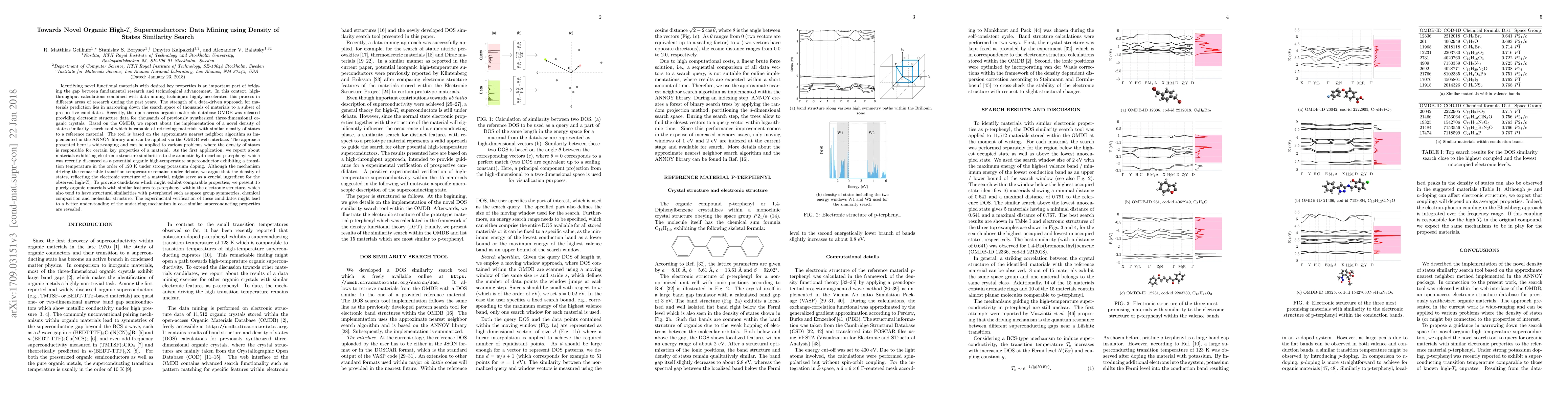 Identifying novel functional materials with desired key properties is an important part of bridging the gap between fundamental research and technological advancement. In this context, high-throughput calculations combined with data-mining techniques highly accelerated this process in different areas of research during the past years. The strength of a data-driven approach for materials prediction lies in narrowing down the search space of thousands of materials to a subset of prospective candidates. Recently, the open-access organic materials database OMDB was released providing electronic structure data for thousands of previously synthesized three-dimensional organic crystals. Based on the OMDB, we report about the implementation of a novel density of states similarity search tool which is capable of retrieving materials with similar density of states to a reference material. The tool is based on the approximate nearest neighbor algorithm as implemented in the ANNOY library and can be applied via the OMDB web interface. The approach presented here is wide-ranging and can be applied to various problems where the density of states is responsible for certain key properties of a material. As the first application, we report about materials exhibiting electronic structure similarities to the aromatic hydrocarbon p-terphenyl which was recently discussed as a potential organic high-temperature superconductor exhibiting a transition temperature in the order of 120~K under strong potassium doping. Although the mechanism driving the remarkable transition temperature remains under debate, we argue that the density of states, reflecting the electronic structure of a material, might serve as a crucial ingredient for the observed high-$T_\mathrm{c}$. To provide candidates which might exhibit comparable properties, we present 15 purely organic materials with similar features to p-terphenyl...