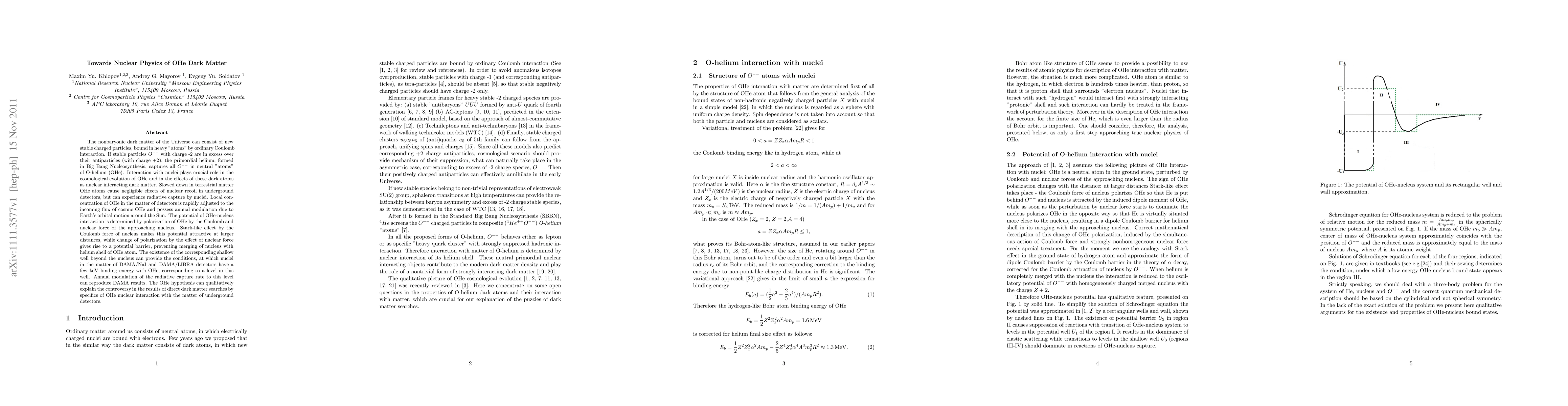 This paper proposes that stable charged particles, forming neutral "atoms" of O-helium (OHe) in the early Universe, could constitute a form of nuclear interacting dark matter. It suggests that OHe's interaction with terrestrial nuclei could explain the DAMA/NaI results, offering an alternative to conventional dark matter models and explaining the observed annual modulation in detector data.