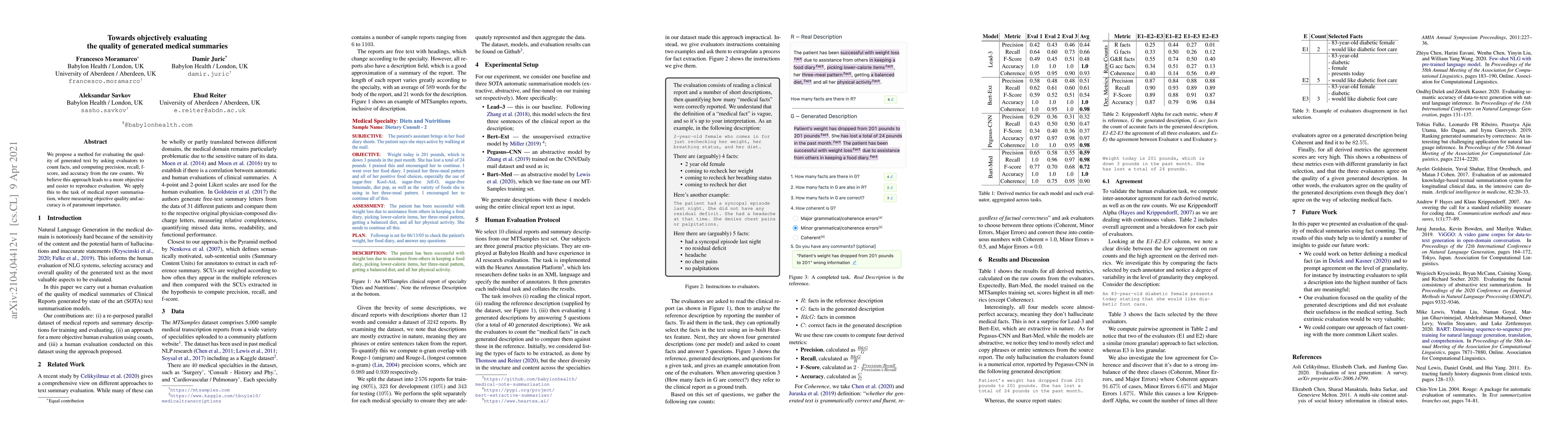This paper proposes a method to evaluate the quality of generated medical summaries by counting facts and calculating precision, recall, f-score, and accuracy, aiming for more objective and reproducible evaluations in critical applications like medical report summarization.