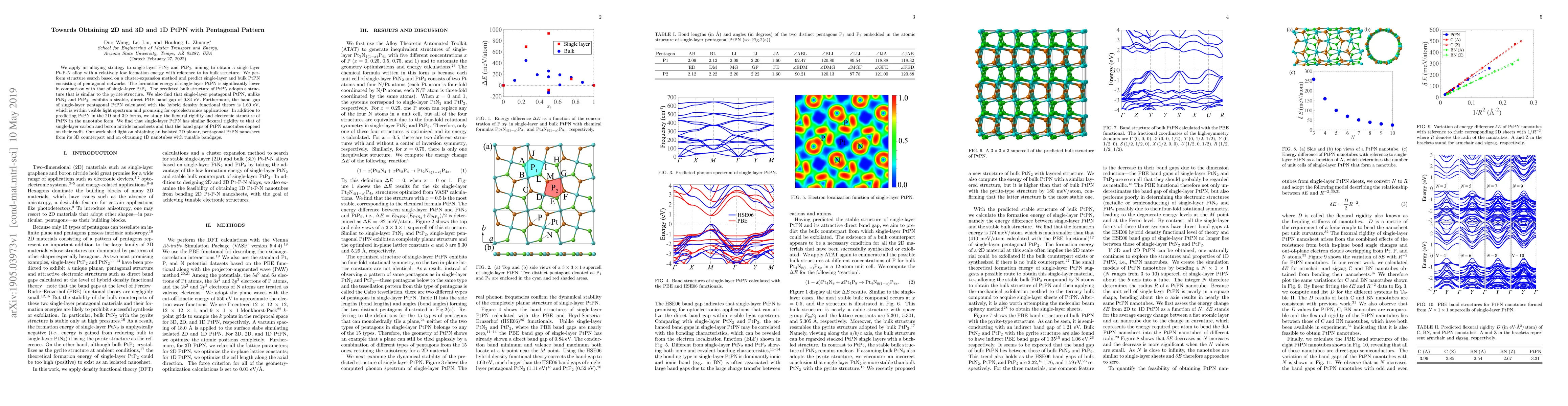 We apply an alloying strategy to single-layer PtN$_2$ and PtP$_2$, aiming to obtain a single-layer Pt-P-N alloy with a relatively low formation energy with reference to its bulk structure. We perform structure search based on a cluster-expansion method and predict single-layer and bulk PtPN consisting of pentagonal networks. The formation energy of single-layer PtPN is significantly lower in comparison with that of single-layer PtP$_2$. The predicted bulk structure of PtPN adopts a structure that is similar to the pyrite structure. We also find that single-layer pentagonal PtPN, unlike PtN$_2$ and PtP$_2$, exhibits a sizable, direct PBE band gap of 0.84 eV. Furthermore, the band gap of single-layer pentagonal PtPN calculated with the hybrid density functional theory is 1.60 eV, which is within visible light spectrum and promising for optoelectronics applications. In addition to predicting PtPN in the 2D and 3D forms, we study the flexural rigidity and electronic structure of PtPN in the nanotube form. We find that single-layer PtPN has similar flexural rigidity to that of single-layer carbon and boron nitride nanosheets and that the band gaps of PtPN nanotubes depend on their radii. Our work shed light on obtaining an isolated 2D planar, pentagonal PtPN nanosheet from its 3D counterpart and on obtaining 1D nanotubes with tunable bandgaps.