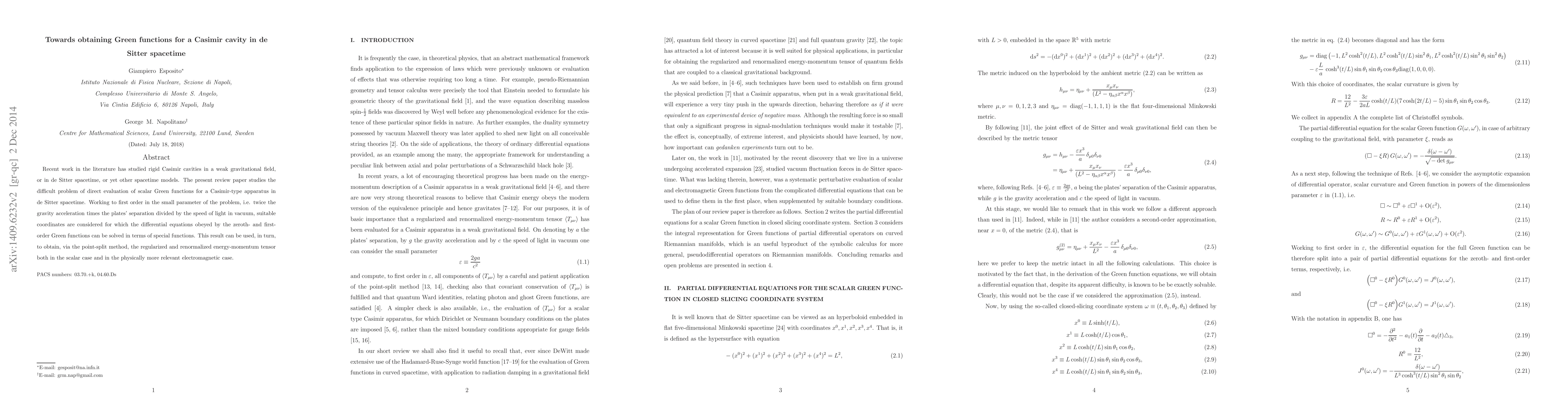 Recent work in the literature has studied rigid Casimir cavities in a weak gravitational field, or in de Sitter spacetime, or yet other spacetime models. The present review paper studies the difficult problem of direct evaluation of scalar Green functions for a Casimir-type apparatus in de Sitter spacetime. Working to first order in the small parameter of the problem, i.e. twice the gravity acceleration times the plates' separation divided by the speed of light in vacuum, suitable coordinates are considered for which the differential equations obeyed by the zeroth- and first-order Green functions can be solved in terms of special functions. This result can be used, in turn, to obtain, via the point-split method, the regularized and renormalized energy-momentum tensor both in the scalar case and in the physically more relevant electromagnetic case.