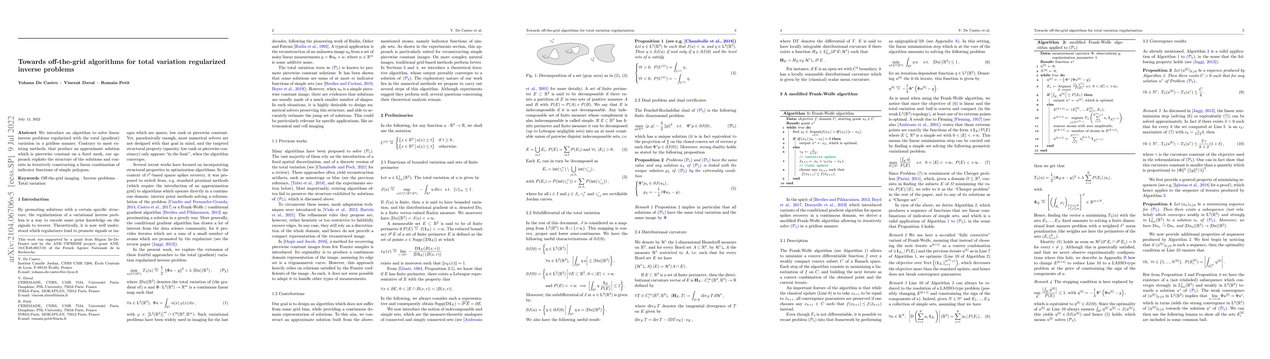 This paper presents an off-the-grid algorithm for solving total variation regularized inverse problems by iteratively constructing a linear combination of indicator functions of simple polygons, rather than relying on a fixed mesh. This method provides a more accurate solution compared to traditional piecewise constant methods.