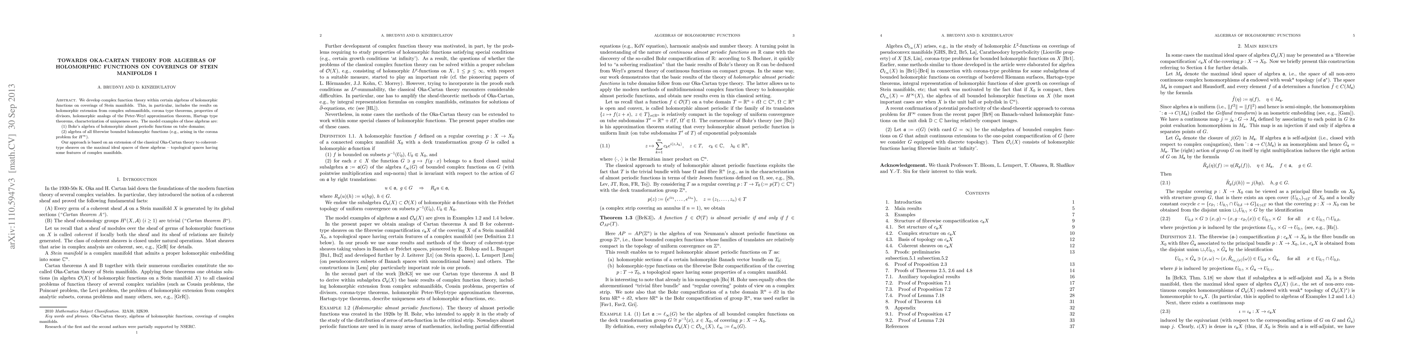 We develop complex function theory within certain algebras of holomorphic functions on coverings of Stein manifolds. This, in particular, includes the results on holomorphic extension from complex submanifolds, corona type theorems, properties of divisors, holomorphic analogs of the Peter-Weyl approximation theorem, Hartogs type theorems, characterization of uniqueness sets. The model examples of these algebras are: (1) Bohr's algebra of holomorphic almost periodic functions on tube domains; (2) algebra of all fibrewise bounded holomorphic functions (e.g., arising in the corona problem for $H^\infty$). Our approach is based on an extension of the classical Oka-Cartan theory to coherent-type sheaves on the maximal ideal spaces of these algebras -- topological spaces having some features of complex manifolds.