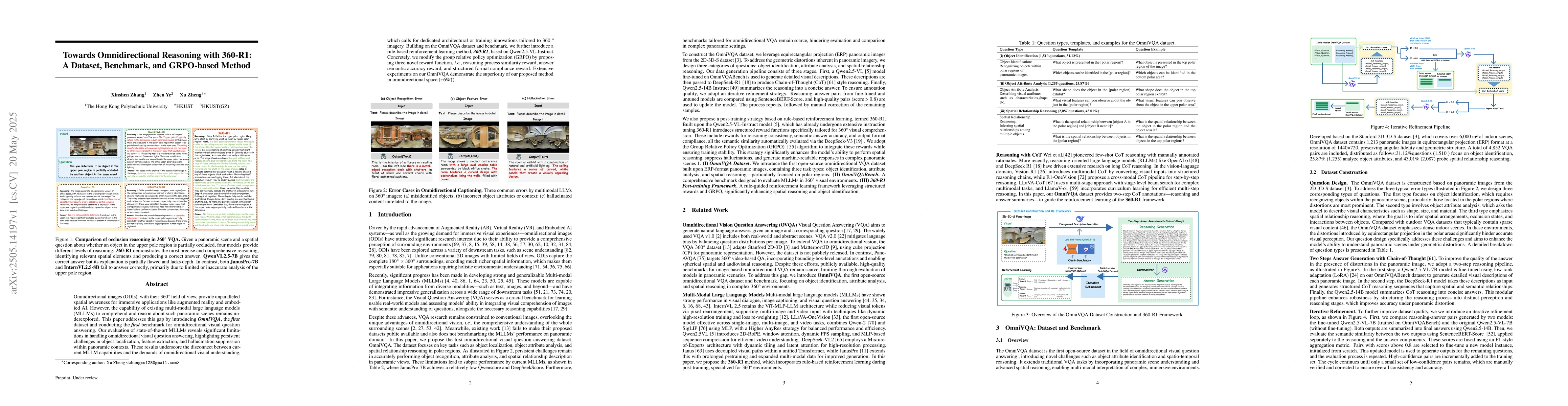This paper introduces OmniVQA, the first dataset and benchmark for omnidirectional visual question answering, revealing significant limitations in existing multi-modal large language models for handling panoramic scenes. It proposes 360-R1, a rule-based reinforcement learning method based on Qwen2.5-VL-Instruct, which improves omnidirectional space understanding by 6%.