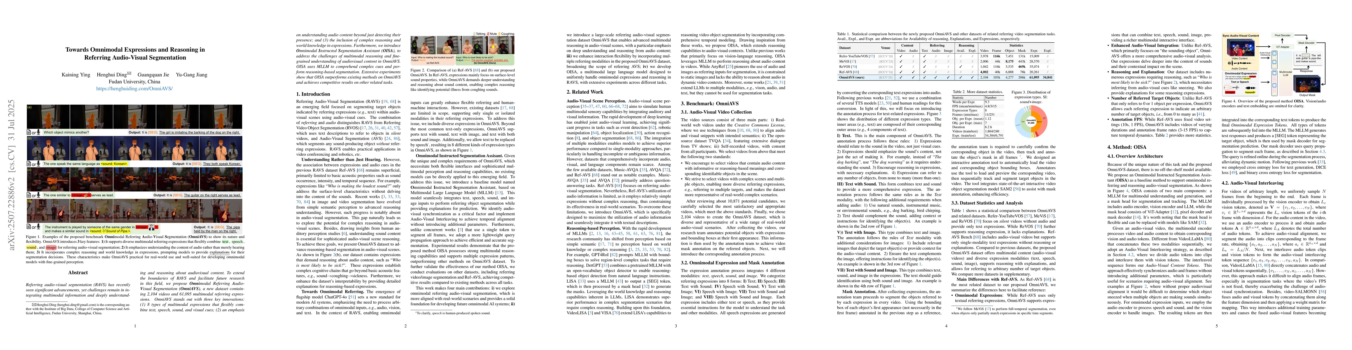 The research introduces OmniAVS, a large-scale dataset supporting advanced multimodal referring and reasoning in audiovisual scenes with 8 types of expressions across text, speech, sound, and image. A baseline model, OISA, is proposed for segmentation, leveraging audio-visual interleaving for temporal alignment and query propagation for efficient segmentation without additional parameters.