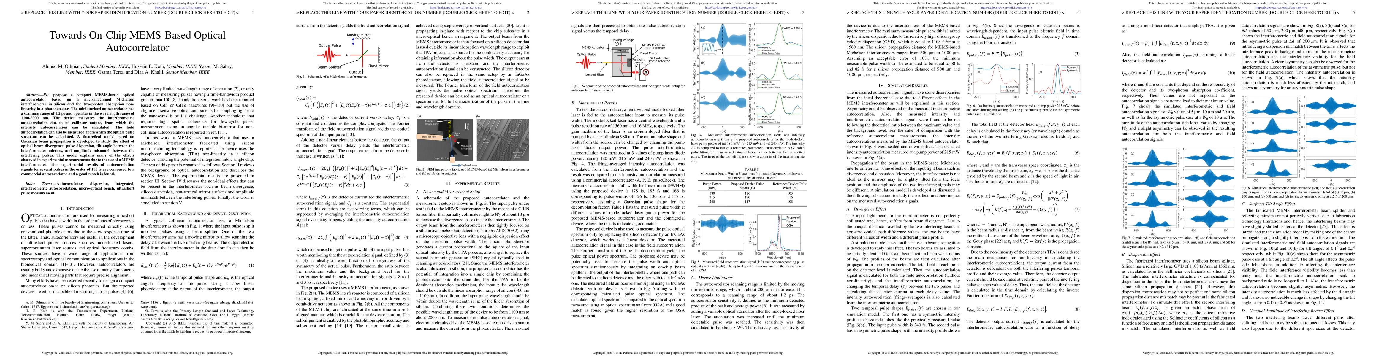 We propose a compact MEMS-based optical autocorrelator based on a micromachined Michelson interferometer in silicon and the two-photon absorption non-linearity in a photodetector. The miniaturized autocorrelator has a scanning range of 1.2 ps and operates in the wavelength range of 1100-2000 nm. The device measures the interferometric autocorrelation due to its collinear nature, from which the intensity autocorrelation can be calculated. The field autocorrelation can also be measured, from which the optical pulse spectrum can be calculated. A theoretical model based on Gaussian beam propagation is developed to study the effect of optical beam divergence, pulse dispersion, tilt angle between the interferometer mirrors, and amplitude mismatch between the interfering pulses. This model explains many of the effects observed in experimental measurements due to the use of a MEMS interferometer. The experimental results of autocorrelation signals for several pulses in the order of 100 fs are compared to a commercial autocorrelator and a good match is found.
