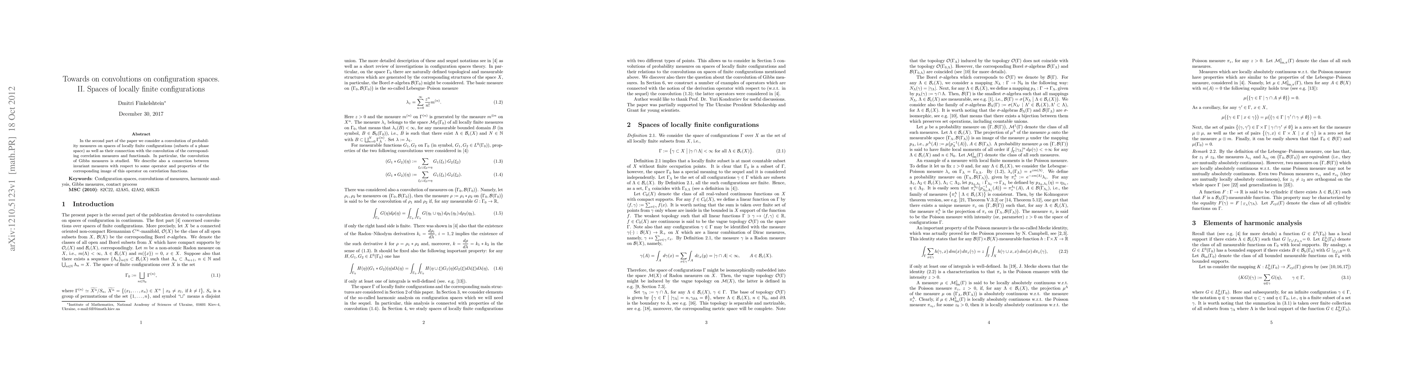 In the second part of the paper we consider a convolution of probability measures on spaces of locally finite configurations (subsets of a phase space) as well as their connection with the convolution of the corresponding correlation measures and functionals. In particular, the convolution of Gibbs measures is studied. We describe also a connection between invariant measures with respect to some operator and properties of the corresponding image of this operator on correlation functions.
