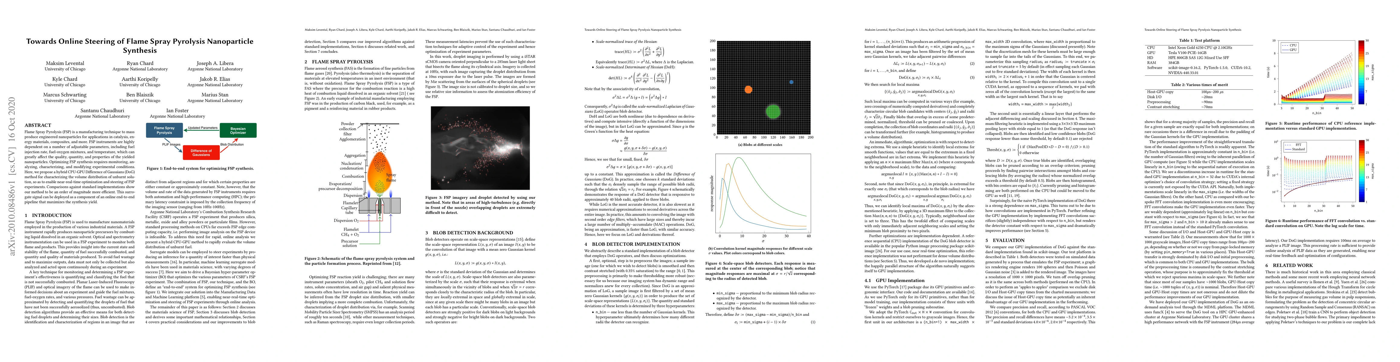 Flame Spray Pyrolysis (FSP) is a manufacturing technique to mass produce engineered nanoparticles for applications in catalysis, energy materials, composites, and more. FSP instruments are highly dependent on a number of adjustable parameters, including fuel injection rate, fuel-oxygen mixtures, and temperature, which can greatly affect the quality, quantity, and properties of the yielded nanoparticles. Optimizing FSP synthesis requires monitoring, analyzing, characterizing, and modifying experimental conditions.Here, we propose a hybrid CPU-GPU Difference of Gaussians (DoG)method for characterizing the volume distribution of unburnt solution, so as to enable near-real-time optimization and steering of FSP experiments. Comparisons against standard implementations show our method to be an order of magnitude more efficient. This surrogate signal can be deployed as a component of an online end-to-end pipeline that maximizes the synthesis yield.