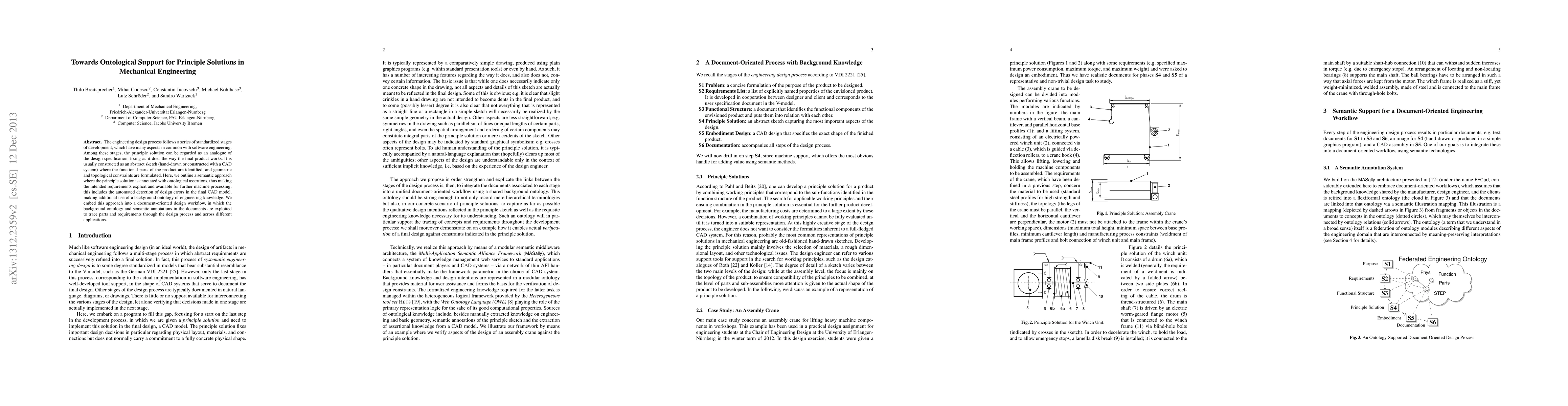 The engineering design process follows a series of standardized stages of development, which have many aspects in common with software engineering. Among these stages, the principle solution can be regarded as an analogue of the design specification, fixing as it does the way the final product works. It is usually constructed as an abstract sketch (hand-drawn or constructed with a CAD system) where the functional parts of the product are identified, and geometric and topological constraints are formulated. Here, we outline a semantic approach where the principle solution is annotated with ontological assertions, thus making the intended requirements explicit and available for further machine processing; this includes the automated detection of design errors in the final CAD model, making additional use of a background ontology of engineering knowledge. We embed this approach into a document-oriented design workflow, in which the background ontology and semantic annotations in the documents are exploited to trace parts and requirements through the design process and across different applications.