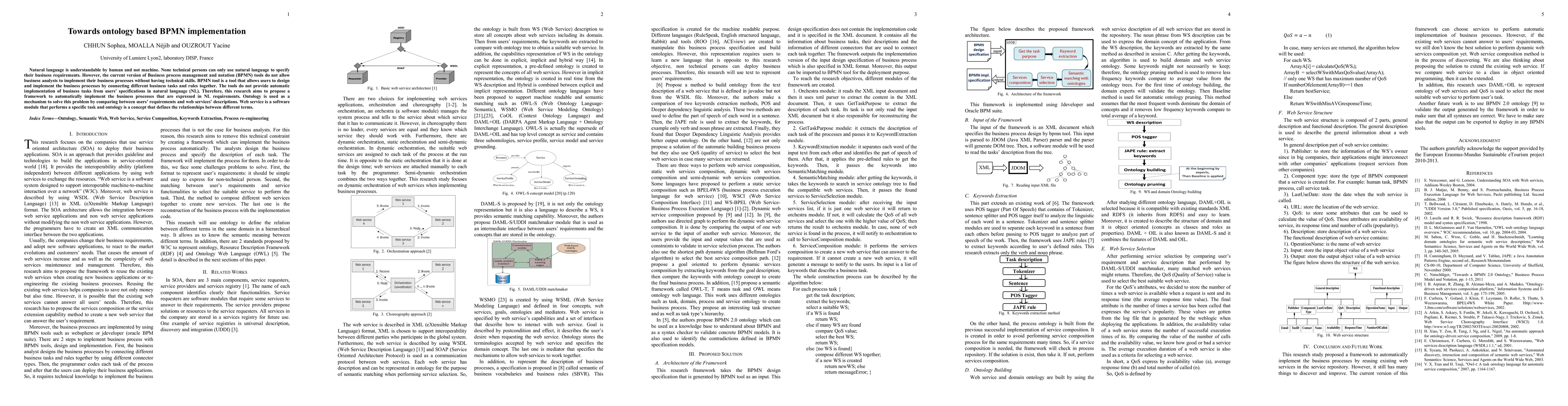 This research proposes a framework to automatically implement business processes from natural language requirements using ontology-based comparison with web services descriptions.