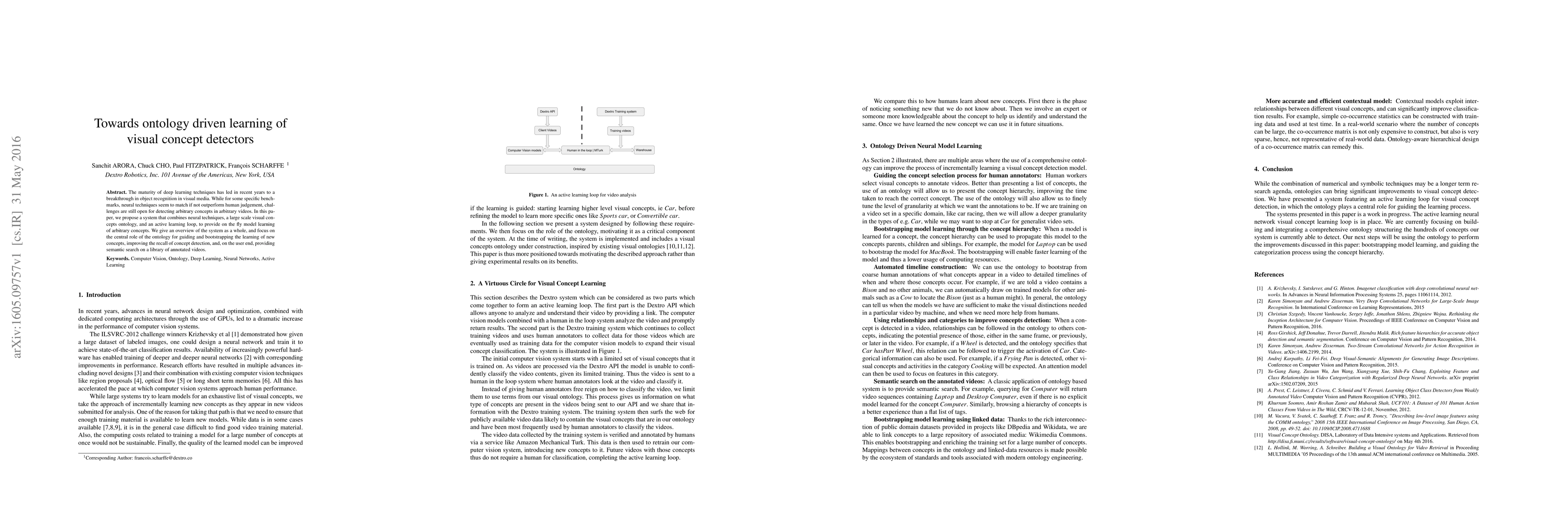 The maturity of deep learning techniques has led in recent years to a breakthrough in object recognition in visual media. While for some specific benchmarks, neural techniques seem to match if not outperform human judgement, challenges are still open for detecting arbitrary concepts in arbitrary videos. In this paper, we propose a system that combines neural techniques, a large scale visual concepts ontology, and an active learning loop, to provide on the fly model learning of arbitrary concepts. We give an overview of the system as a whole, and focus on the central role of the ontology for guiding and bootstrapping the learning of new concepts, improving the recall of concept detection, and, on the user end, providing semantic search on a library of annotated videos.
