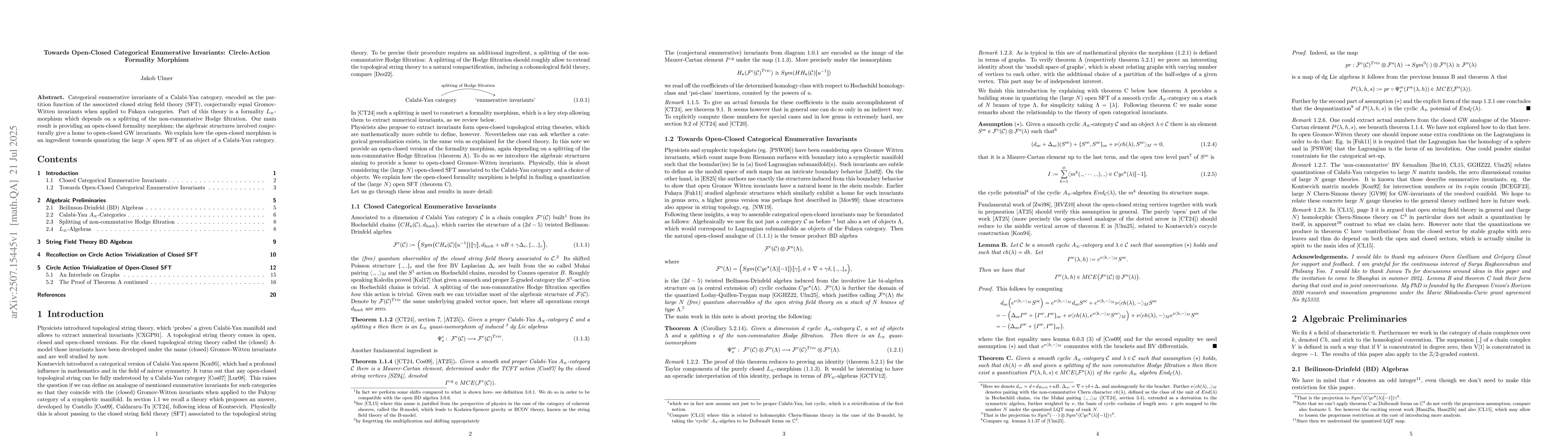 Categorical enumerative invariants of a Calabi-Yau category, encoded as the partition function of the associated closed string field theory (SFT), conjecturally equal Gromov-Witten invariants when applied to Fukaya categories. Part of this theory is a formality $L_\infty$ morphism which depends on a splitting of the non-commutative Hodge filtration. Our main result is providing an open-closed formality morphism; the algebraic structures involved conjecturallygive a home to open-closed GW invariants. We explain how the open-closed morphism is an ingredient towards quantizing the large $N$ open SFT of an object of a Calabi-Yau category.
