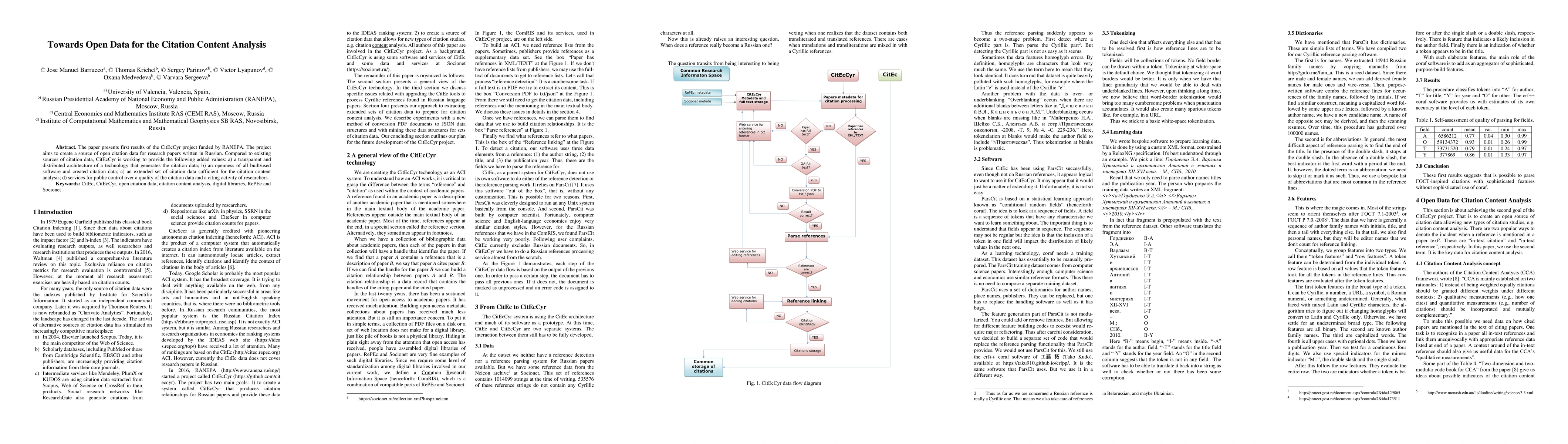 The paper presents first results of the CitEcCyr project funded by RANEPA. The project aims to create a source of open citation data for research papers written in Russian. Compared to existing sources of citation data, CitEcCyr is working to provide the following added values: a) a transparent and distributed architecture of a technology that generates the citation data; b) an openness of all built/used software and created citation data; c) an extended set of citation data sufficient for the citation content analysis; d) services for public control over a quality of the citation data and a citing activity of researchers.