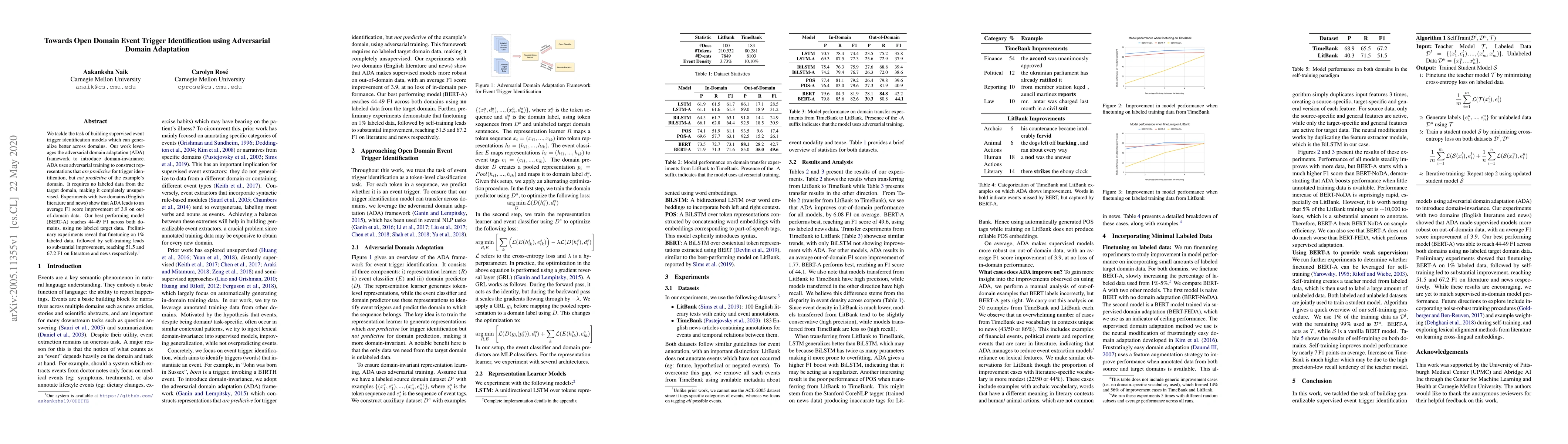 This paper proposes an adversarial domain adaptation (ADA) framework to improve supervised event trigger identification models' generalization across domains. ADA achieves domain-invariance without requiring labeled target domain data, showing an average F1 score improvement of 3.9 on out-of-domain data. Finetuning on a small amount of labeled data followed by self-training further boosts performance.