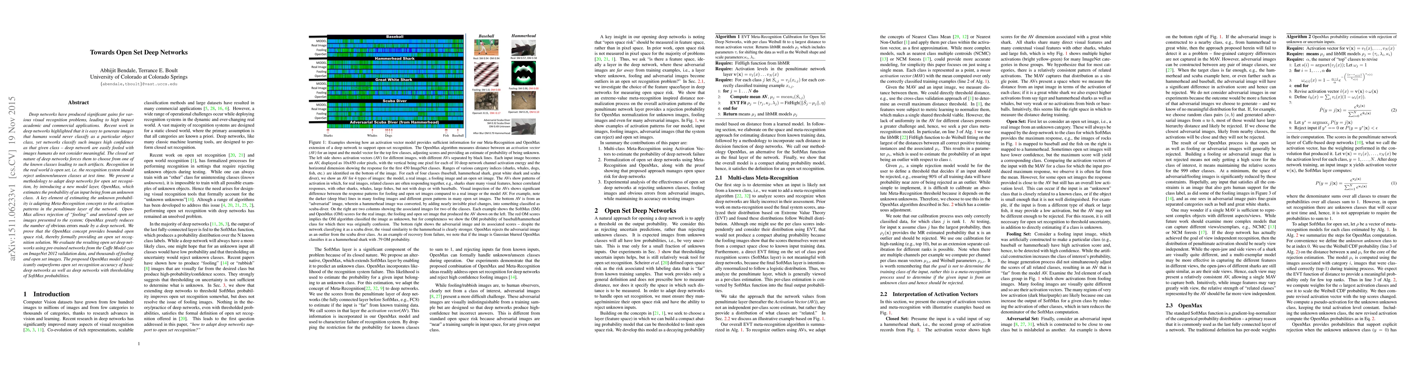 This paper presents OpenMax, a new model layer for adapting deep networks to open set recognition, which estimates the probability of an input being from an unknown class. The OpenMax layer, combined with Meta-Recognition concepts, allows the network to reject "fooling" and unrelated open set images, significantly improving the accuracy of open set recognition compared to traditional deep networks.