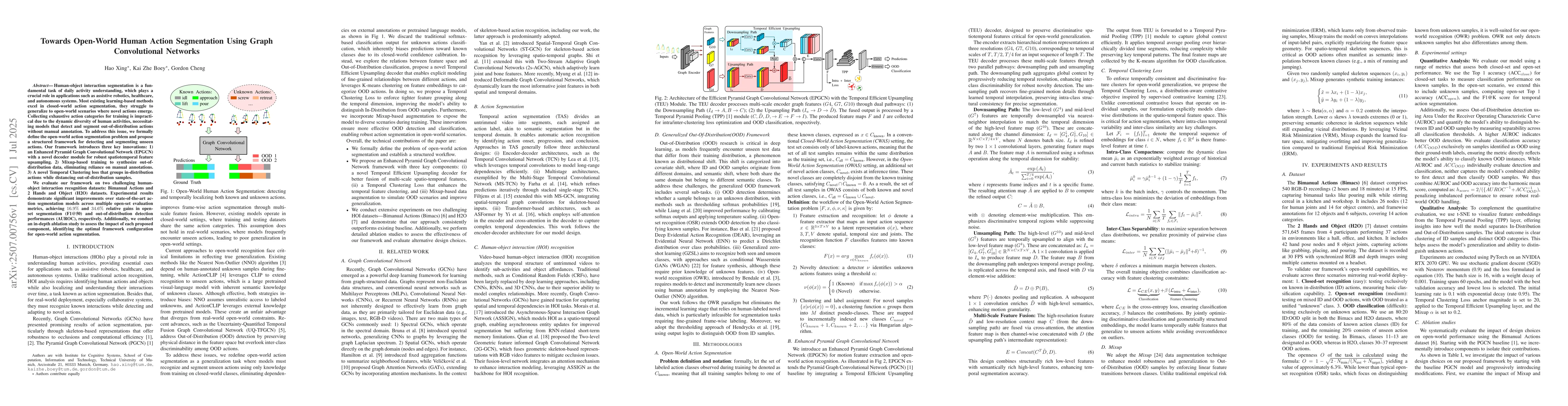 This research introduces an open-world human action segmentation framework using Graph Convolutional Networks. It proposes an Enhanced Pyramid Graph Convolutional Network (EPGCN), Mixup-based training for synthetic OOD data, and a Temporal Clustering loss. Evaluated on Bimanual Actions and H2O datasets, the framework outperforms existing models in open-set segmentation and out-of-distribution detection, showcasing improvements of 16.9% and 34.6% respectively in F1@50 and AUROC metrics.