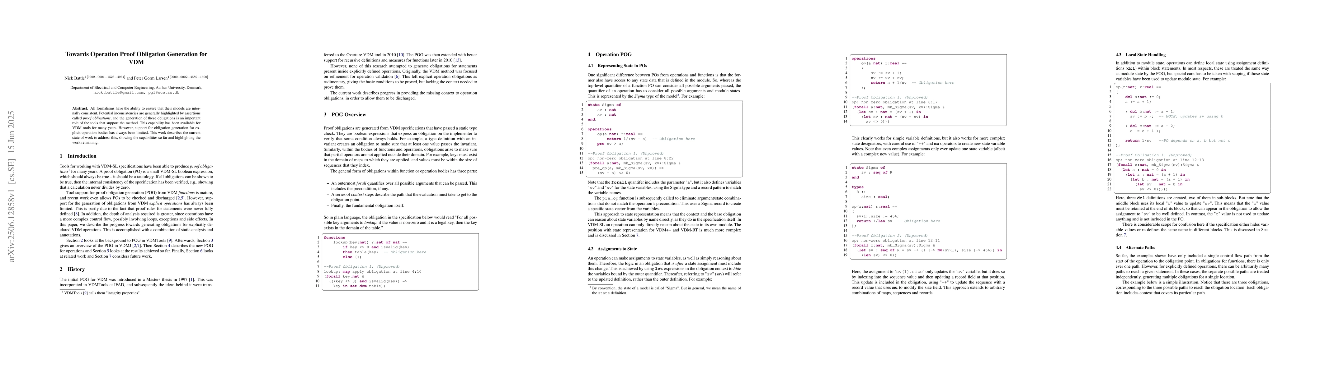 The paper presents advancements in generating proof obligations for explicit operation bodies in VDM, extending to complex state designators, maps, sequences, records, and handling ambiguous states from operation calls.