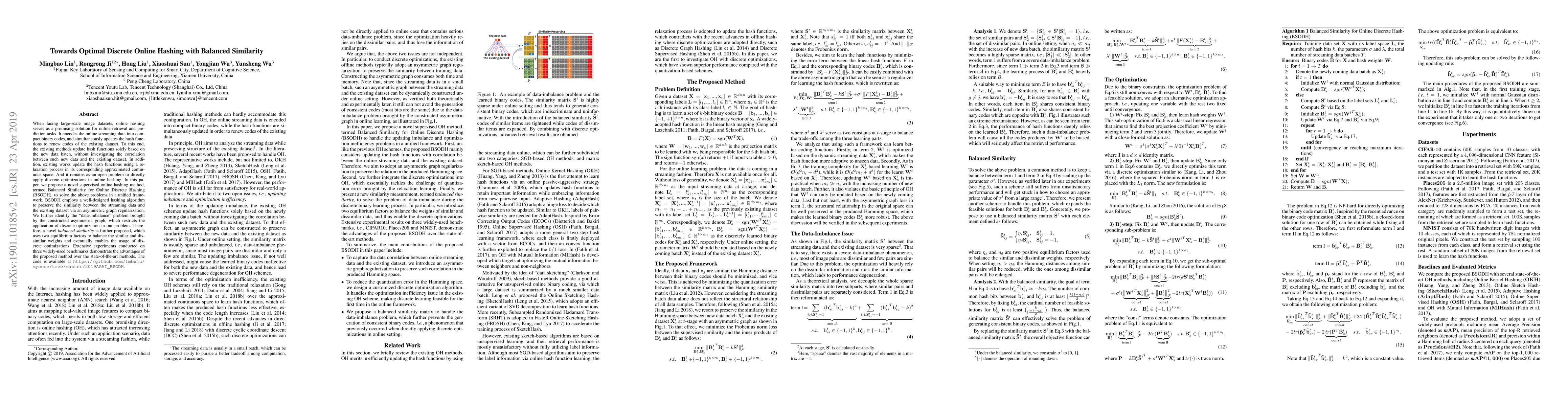 This paper proposes a novel online hashing method called BSODH to address the challenges of updating hash functions in large-scale image datasets. It introduces a balanced similarity approach to balance similar and dissimilar weights, enabling the use of discrete optimizations to improve hashing efficiency and similarity preservation.