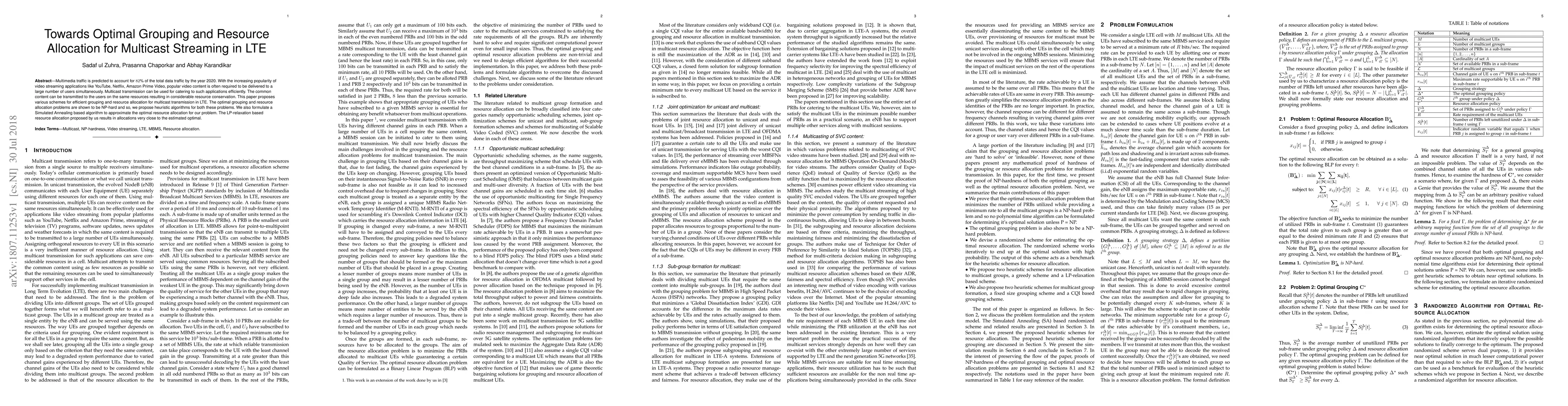 This paper explores efficient grouping and resource allocation strategies for multicast streaming in LTE networks, addressing the growing demand for multimedia traffic. It proposes heuristic algorithms to tackle the NP-hard problems of optimal grouping and resource allocation, along with a Simulated Annealing approach and an LP-relaxation method that yields near-optimal resource allocations.
