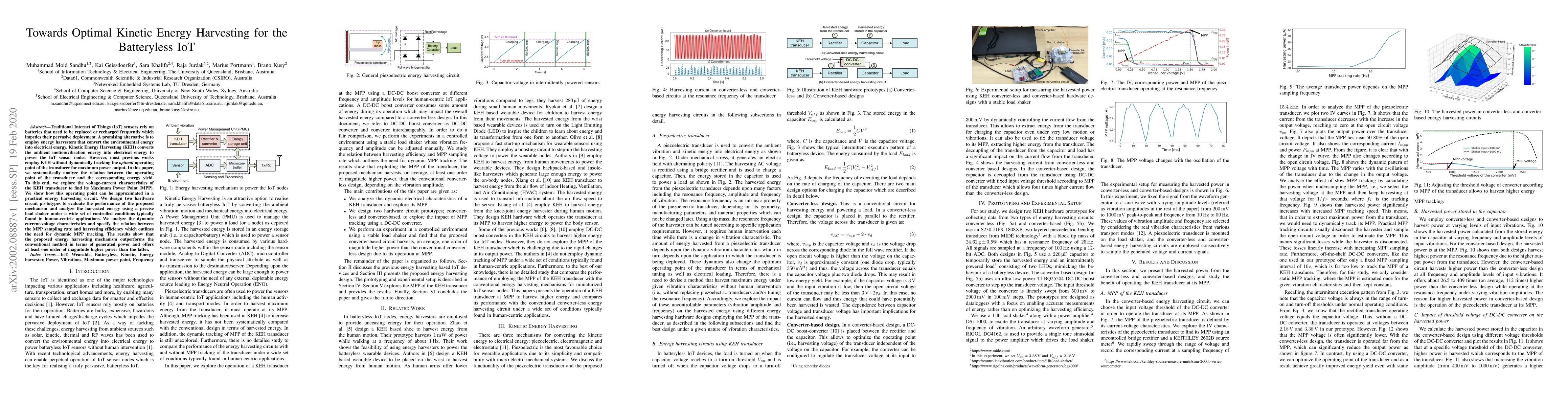 This paper investigates kinetic energy harvesting for batteryless IoT sensors, focusing on dynamically tracking the Maximum Power Point (MPP) of the transducer for optimal energy yield. The study designs hardware prototypes and evaluates performance under controlled conditions, demonstrating significantly higher power generation compared to conventional methods.