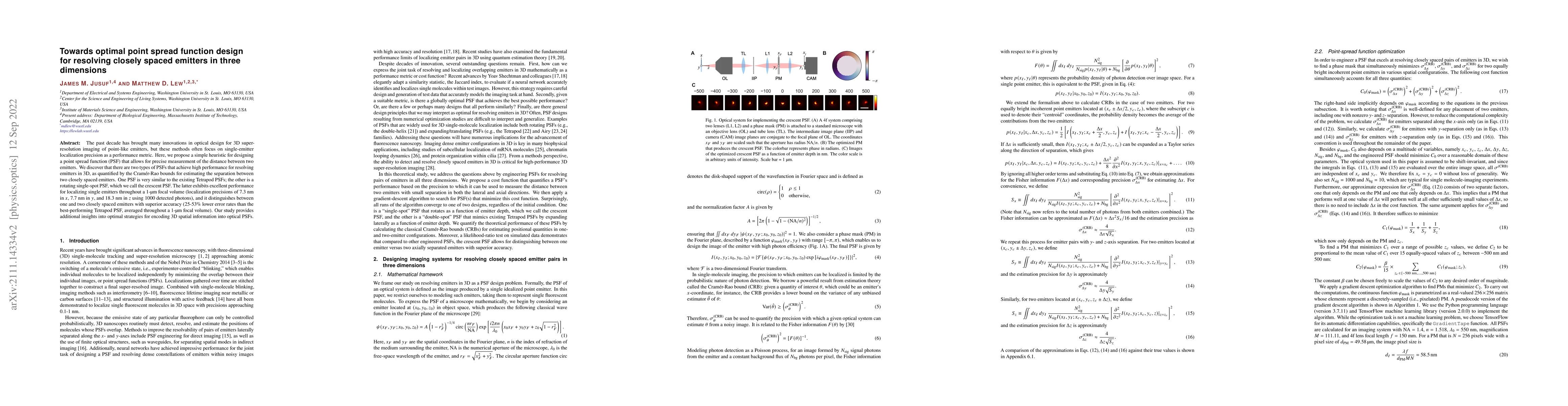 This paper proposes a new heuristic for designing point spread functions (PSFs) to enhance the resolution of closely spaced emitters in 3D super-resolution imaging. The study identifies two effective PSFs: a crescent PSF that outperforms existing Tetrapod PSFs in distinguishing between single and double emitters, achieving superior localization precision and lower error rates.
