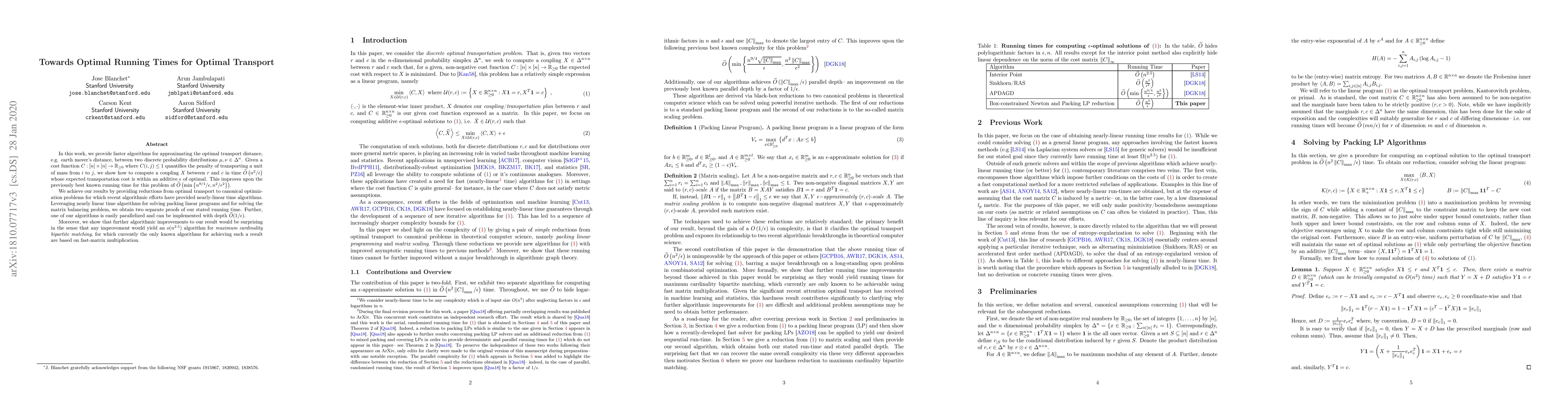 In this work, we provide faster algorithms for approximating the optimal transport distance, e.g. earth mover's distance, between two discrete probability distributions $\mu, \nu \in \Delta^n$. Given a cost function $C : [n] \times [n] \to \mathbb{R}_{\geq 0}$ where $C(i,j) \leq 1$ quantifies the penalty of transporting a unit of mass from $i$ to $j$, we show how to compute a coupling $X$ between $r$ and $c$ in time $\widetilde{O}\left(n^2 /\epsilon \right)$ whose expected transportation cost is within an additive $\epsilon$ of optimal. This improves upon the previously best known running time for this problem of $\widetilde{O}\left(\text{min}\left\{ n^{9/4}/\epsilon, n^2/\epsilon^2 \right\}\right)$. We achieve our results by providing reductions from optimal transport to canonical optimization problems for which recent algorithmic efforts have provided nearly-linear time algorithms. Leveraging nearly linear time algorithms for solving packing linear programs and for solving the matrix balancing problem, we obtain two separate proofs of our stated running time. Further, one of our algorithms is easily parallelized and can be implemented with depth $\widetilde{O}(1/\epsilon)$. Moreover, we show that further algorithmic improvements to our result would be surprising in the sense that any improvement would yield an $o(n^{2.5})$ algorithm for \textit{maximum cardinality bipartite matching}, for which currently the only known algorithms for achieving such a result are based on fast-matrix multiplication.