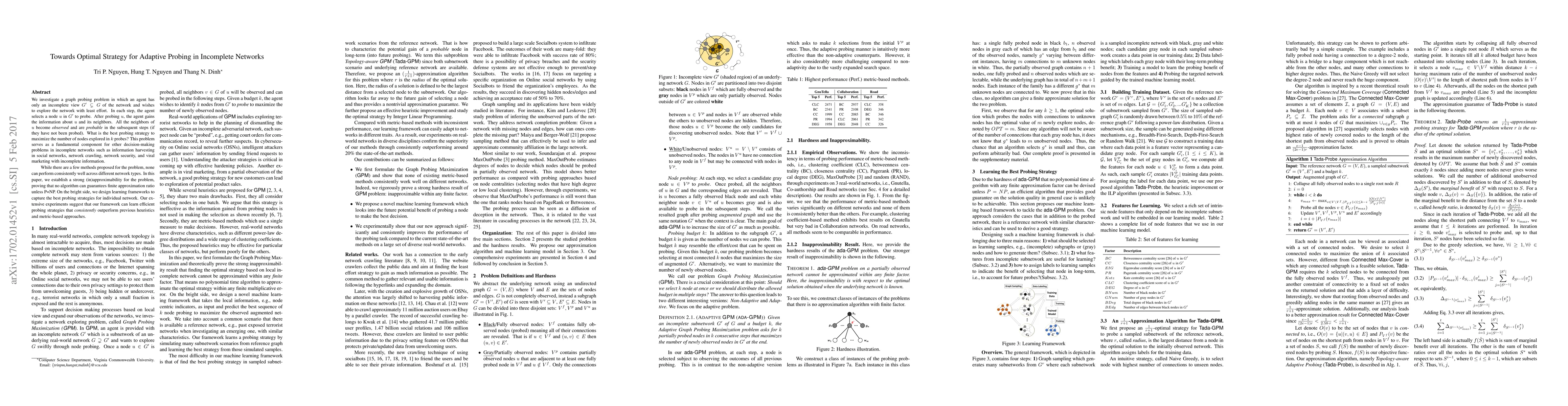 We investigate a graph probing problem in which an agent has only an incomplete view $G' \subsetneq G$ of the network and wishes to explore the network with least effort. In each step, the agent selects a node $u$ in $G'$ to probe. After probing $u$, the agent gains the information about $u$ and its neighbors. All the neighbors of $u$ become \emph{observed} and are \emph{probable} in the subsequent steps (if they have not been probed). What is the best probing strategy to maximize the number of nodes explored in $k$ probes? This problem serves as a fundamental component for other decision-making problems in incomplete networks such as information harvesting in social networks, network crawling, network security, and viral marketing with incomplete information. While there are a few methods proposed for the problem, none can perform consistently well across different network types. In this paper, we establish a strong (in)approximability for the problem, proving that no algorithm can guarantees finite approximation ratio unless P=NP. On the bright side, we design learning frameworks to capture the best probing strategies for individual network. Our extensive experiments suggest that our framework can learn efficient probing strategies that \emph{consistently} outperform previous heuristics and metric-based approaches.