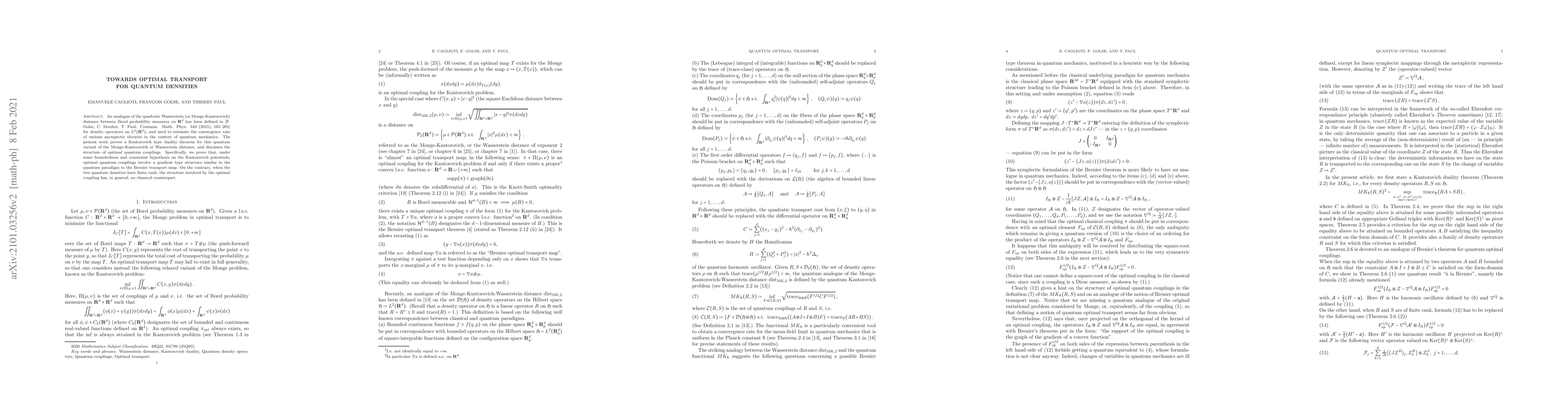An analogue of the quadratic Wasserstein (or Monge-Kantorovich) distance between Borel probability measures on $\mathbf{R}^d$ has been defined in [F. Golse, C. Mouhot, T. Paul: Commun. Math. Phys. 343 (2015), 165-205] for density operators on $L^2(\mathbf{R}^d)$, and used to estimate the convergence rate of various asymptotic theories in the context of quantum mechanics. The present work proves a Kantorovich type duality theorem for this quantum variant of the Monge-Kantorovich or Wasserstein distance, and discusses the structure of optimal quantum couplings. Specifically, we prove that optimal quantum couplings involve a gradient type structure similar to the Brenier transport map (which is the gradient of a convex function), or more generally, to the subdifferential of a l.s.c. convex function as in the Knott-Smith optimality criterion (see Theorem 2.12 in [C. Villani: "Topics in Optimal Transportation", Amer. Math. Soc. 2003]).