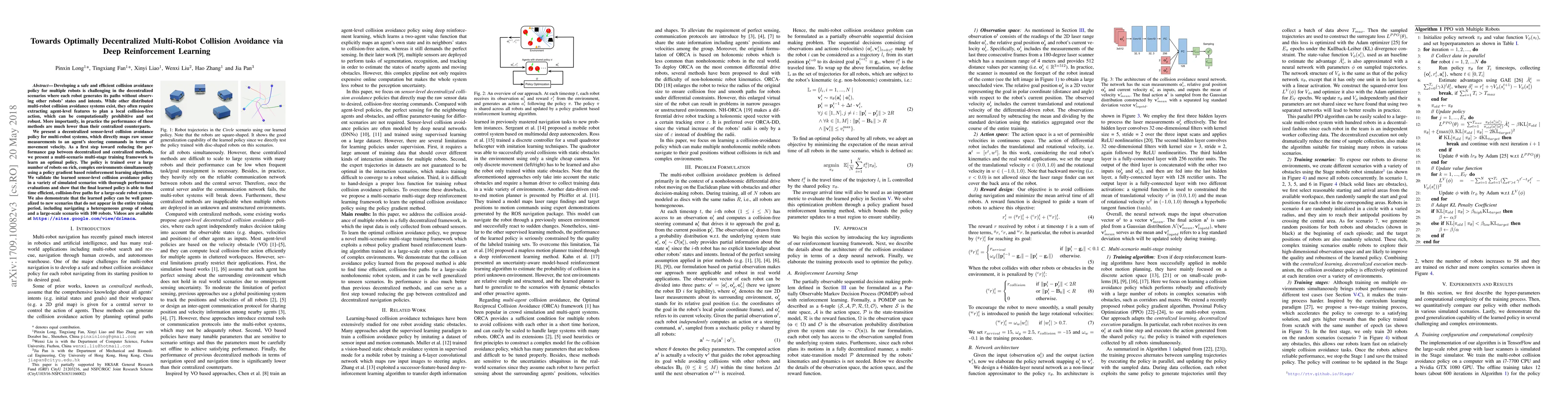 This paper proposes a decentralized collision avoidance policy for multi-robot systems using deep reinforcement learning, which directly maps raw sensor data to steering commands. The method is trained in complex, multi-robot scenarios and demonstrates effective, time-efficient collision-free navigation, even in large-scale and heterogeneous groups.