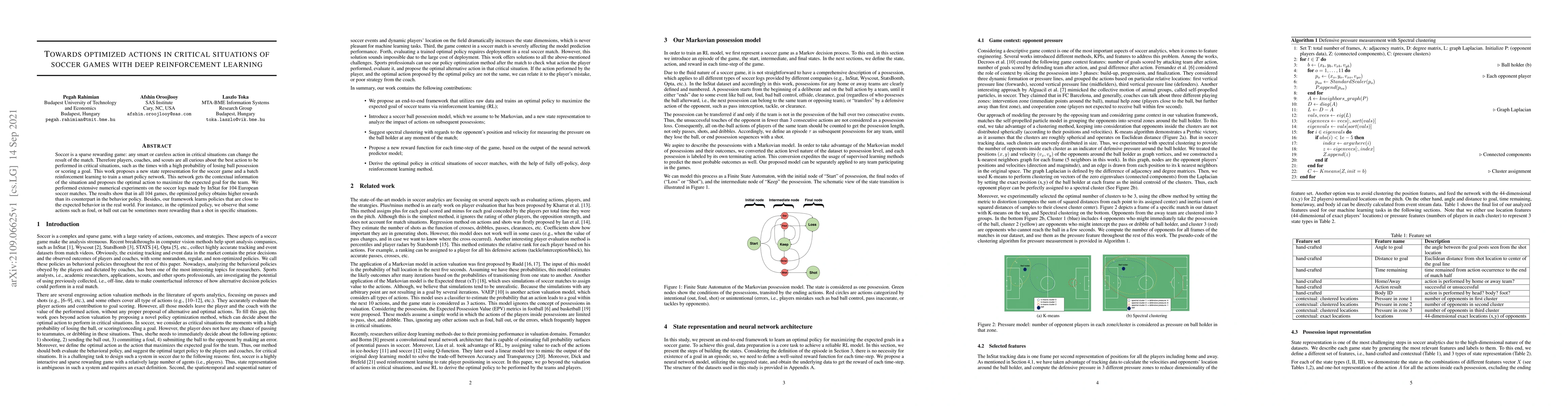Soccer is a sparse rewarding game: any smart or careless action in critical situations can change the result of the match. Therefore players, coaches, and scouts are all curious about the best action to be performed in critical situations, such as the times with a high probability of losing ball possession or scoring a goal. This work proposes a new state representation for the soccer game and a batch reinforcement learning to train a smart policy network. This network gets the contextual information of the situation and proposes the optimal action to maximize the expected goal for the team. We performed extensive numerical experiments on the soccer logs made by InStat for 104 European soccer matches. The results show that in all 104 games, the optimized policy obtains higher rewards than its counterpart in the behavior policy. Besides, our framework learns policies that are close to the expected behavior in the real world. For instance, in the optimized policy, we observe that some actions such as foul, or ball out can be sometimes more rewarding than a shot in specific situations.