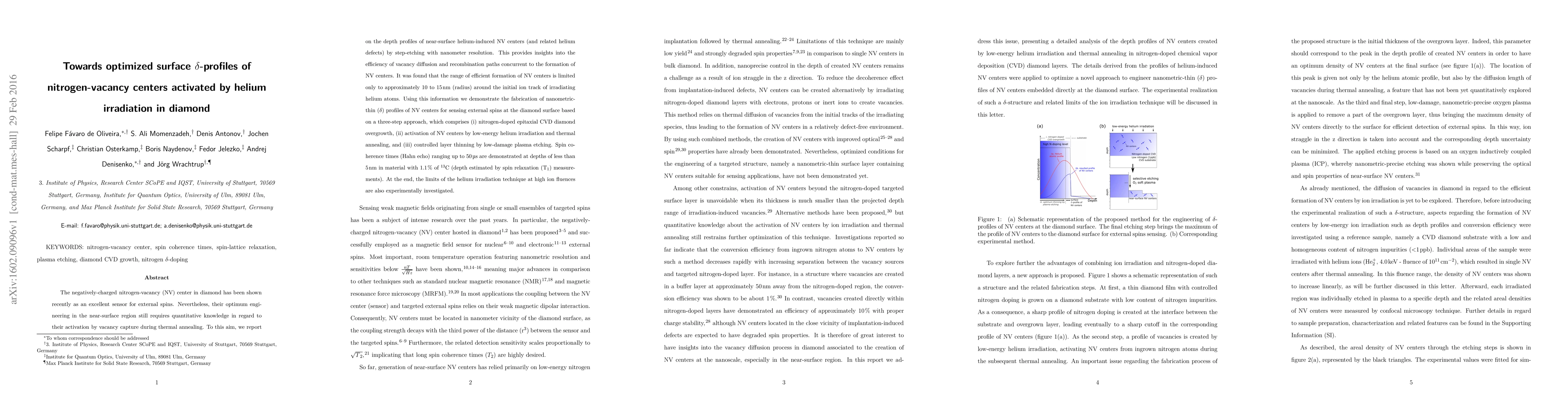 This paper explores the optimization of nitrogen-vacancy (NV) centers in diamond for spin sensing via helium irradiation and thermal annealing, revealing that efficient NV center formation occurs within a 10-15 nm radius around the initial helium ion track. The study demonstrates a three-step fabrication process to create nanometric-thin NV center profiles, achieving spin coherence times of up to 50 µs at depths less than 5 nm.