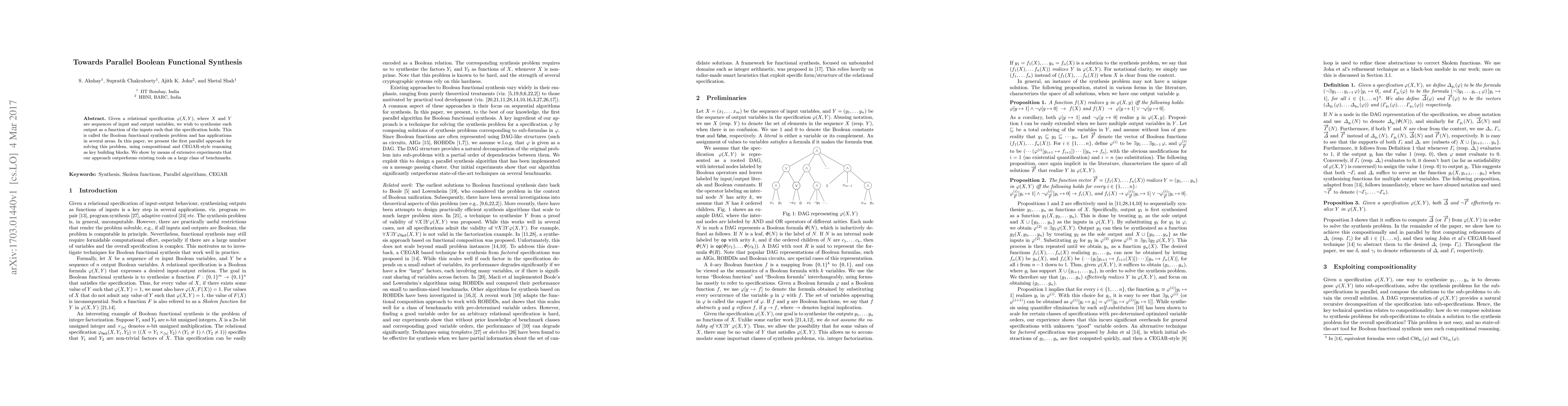 Given a relational specification R(X, Y), where X and Y are sequences of input and output variables, we wish to synthesize each output as a function of the inputs such that the specification holds. This is called the Boolean functional synthesis problem and has applications in several areas. In this paper, we present the first parallel approach for solving this problem, using compositional and CEGAR-style reasoning as key building blocks. We show by means of extensive experiments that our approach outperforms existing tools on a large class of benchmarks.
