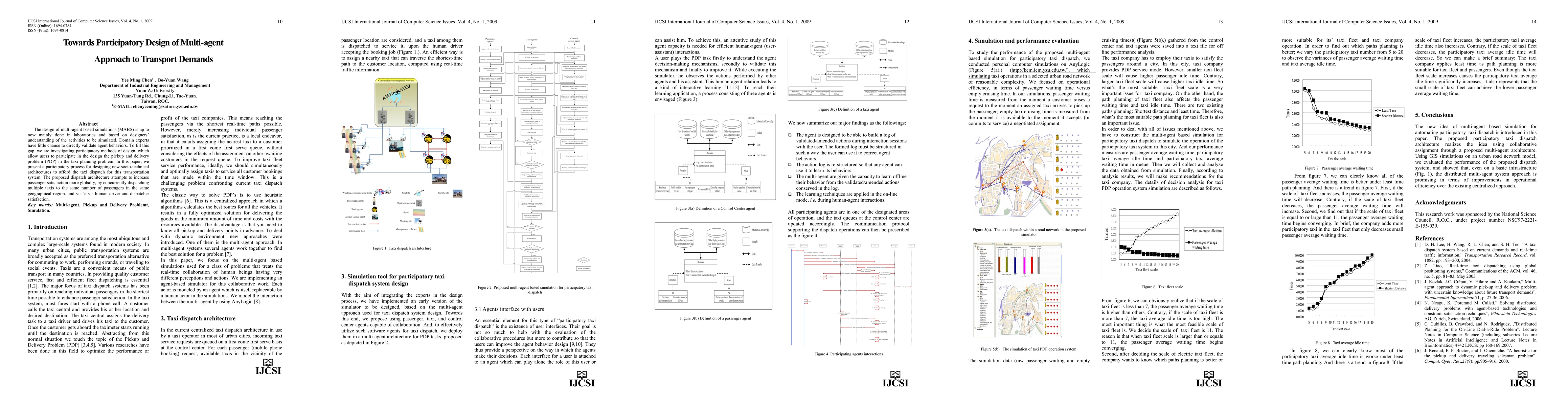 The design of multi-agent based simulations (MABS) is up to now mainly done in laboratories and based on designers' understanding of the activities to be simulated. Domain experts have little chance to directly validate agent behaviors. To fill this gap, we are investigating participatory methods of design, which allow users to participate in the design the pickup and delivery problem (PDP) in the taxi planning problem. In this paper, we present a participatory process for designing new socio-technical architectures to afford the taxi dispatch for this transportation system. The proposed dispatch architecture attempts to increase passenger satisfaction more globally, by concurrently dispatching multiple taxis to the same number of passengers in the same geographical region, and vis-avis human driver and dispatcher satisfaction.