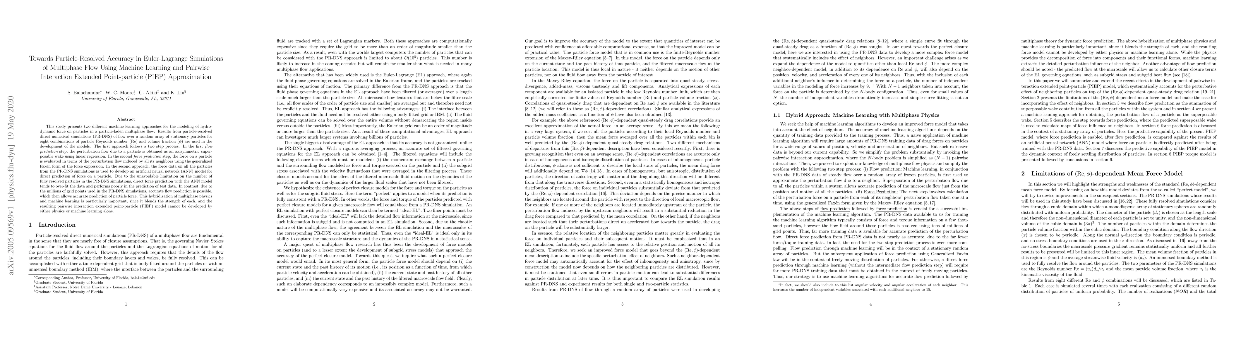 This study presents two different machine learning approaches for the modeling of hydrodynamic force on particles in a particle-laden multiphase flow. Results from particle-resolved direct numerical simulations (PR-DNS) of flow over a random array of stationary particles for eight combinations of particle Reynolds number ($Re$) and volume fraction ($\phi$) are used in the development of the models. The first approach follows a two step process. In the first flow prediction step, the perturbation flow due to a particle is obtained as an axisymmetric superposable wake using linear regression. In the second force prediction step, the force on a particle is evaluated in terms of the perturbation flow induced by all its neighbors using the generalized Fax\'en form of the force expression. In the second approach, the force data on all the particles from the PR-DNS simulations is used to develop an artificial neural network (ANN) model for direct prediction of force on a particle. Due to the unavoidable limitation on the number of fully resolved particles in the PR-DNS simulations, direct force prediction with the ANN model tends to over-fit the data and performs poorly in the prediction of test data. In contrast, due to the millions of grid points used in the PR-DNS simulations, accurate flow prediction is possible, which then allows accurate prediction of particle force. This hybridization of multiphase physics and machine learning is particularly important, since it blends the strength of each, and the resulting pairwise interaction extended point-particle (PIEP) model cannot be developed by either physics or machine learning alone.