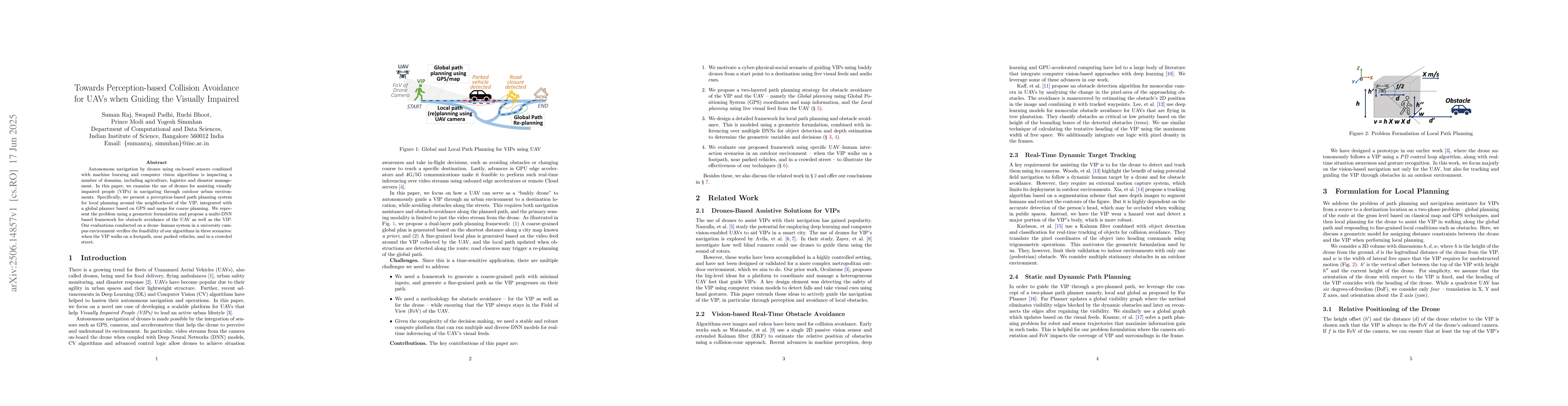 Autonomous navigation by drones using onboard sensors combined with machine learning and computer vision algorithms is impacting a number of domains, including agriculture, logistics, and disaster management. In this paper, we examine the use of drones for assisting visually impaired people (VIPs) in navigating through outdoor urban environments. Specifically, we present a perception-based path planning system for local planning around the neighborhood of the VIP, integrated with a global planner based on GPS and maps for coarse planning. We represent the problem using a geometric formulation and propose a multi DNN based framework for obstacle avoidance of the UAV as well as the VIP. Our evaluations conducted on a drone human system in a university campus environment verifies the feasibility of our algorithms in three scenarios; when the VIP walks on a footpath, near parked vehicles, and in a crowded street.