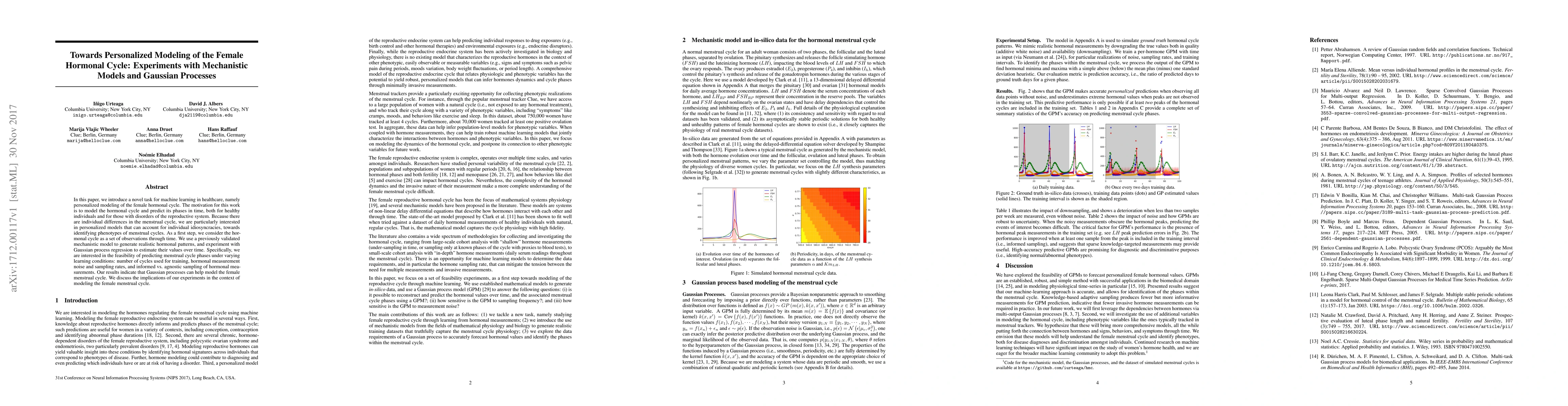 In this paper, we introduce a novel task for machine learning in healthcare, namely personalized modeling of the female hormonal cycle. The motivation for this work is to model the hormonal cycle and predict its phases in time, both for healthy individuals and for those with disorders of the reproductive system. Because there are individual differences in the menstrual cycle, we are particularly interested in personalized models that can account for individual idiosyncracies, towards identifying phenotypes of menstrual cycles. As a first step, we consider the hormonal cycle as a set of observations through time. We use a previously validated mechanistic model to generate realistic hormonal patterns, and experiment with Gaussian process regression to estimate their values over time. Specifically, we are interested in the feasibility of predicting menstrual cycle phases under varying learning conditions: number of cycles used for training, hormonal measurement noise and sampling rates, and informed vs. agnostic sampling of hormonal measurements. Our results indicate that Gaussian processes can help model the female menstrual cycle. We discuss the implications of our experiments in the context of modeling the female menstrual cycle.