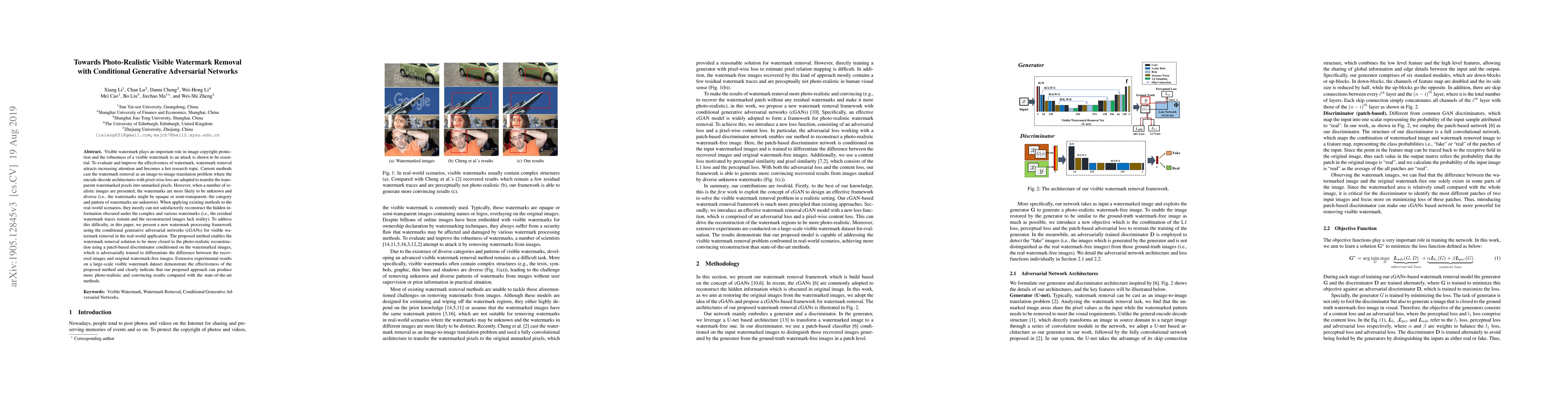 Visible watermark plays an important role in image copyright protection and the robustness of a visible watermark to an attack is shown to be essential. To evaluate and improve the effectiveness of watermark, watermark removal attracts increasing attention and becomes a hot research top. Current methods cast the watermark removal as an image-to-image translation problem where the encode-decode architectures with pixel-wise loss are adopted to transfer the transparent watermarked pixels into unmarked pixels. However, when a number of realistic images are presented, the watermarks are more likely to be unknown and diverse (i.e., the watermarks might be opaque or semi-transparent; the category and pattern of watermarks are unknown). When applying existing methods to the real-world scenarios, they mostly can not satisfactorily reconstruct the hidden information obscured under the complex and various watermarks (i.e., the residual watermark traces remain and the reconstructed images lack reality). To address this difficulty, in this paper, we present a new watermark processing framework using the conditional generative adversarial networks (cGANs) for visible watermark removal in the real-world application. The proposed method enables the watermark removal solution to be more closed to the photo-realistic reconstruction using a patch-based discriminator conditioned on the watermarked images, which is adversarially trained to differentiate the difference between the recovered images and original watermark-free images. Extensive experimental results on a large-scale visible watermark dataset demonstrate the effectiveness of the proposed method and clearly indicate that our proposed approach can produce more photo-realistic and convincing results compared with the state-of-the-art methods.