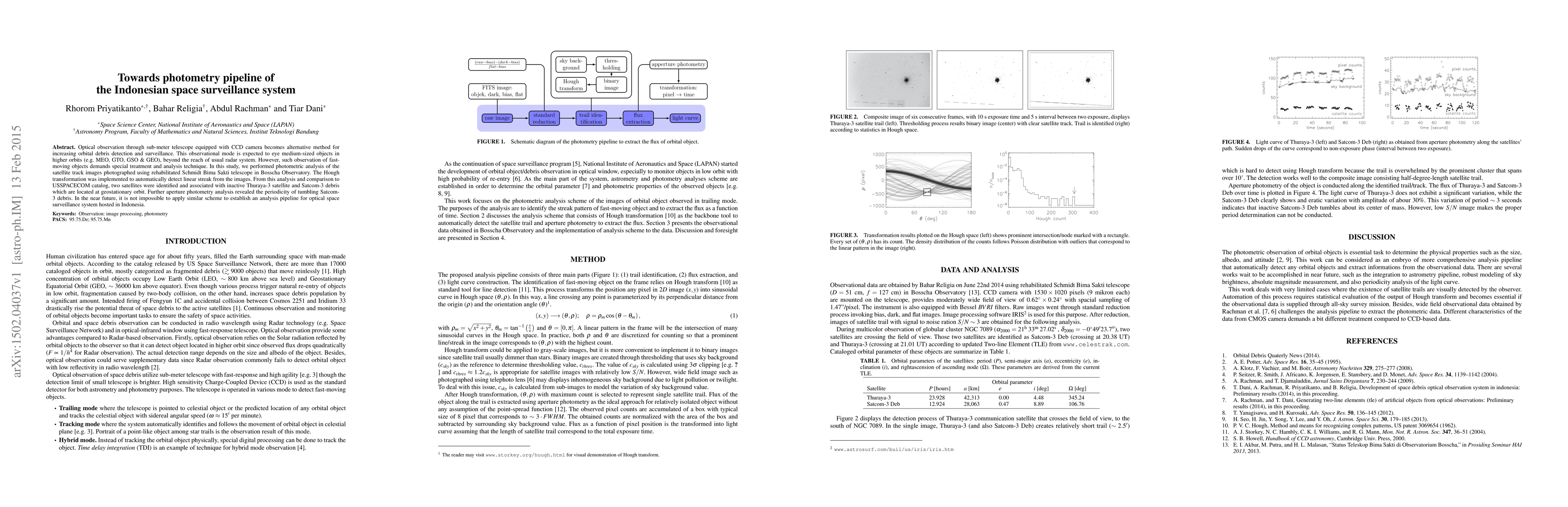 A study using a sub-meter telescope to detect medium-sized objects in higher orbits used photometric analysis and Hough transformation to identify two satellites and debris; periodicity of tumbling debris was also found.