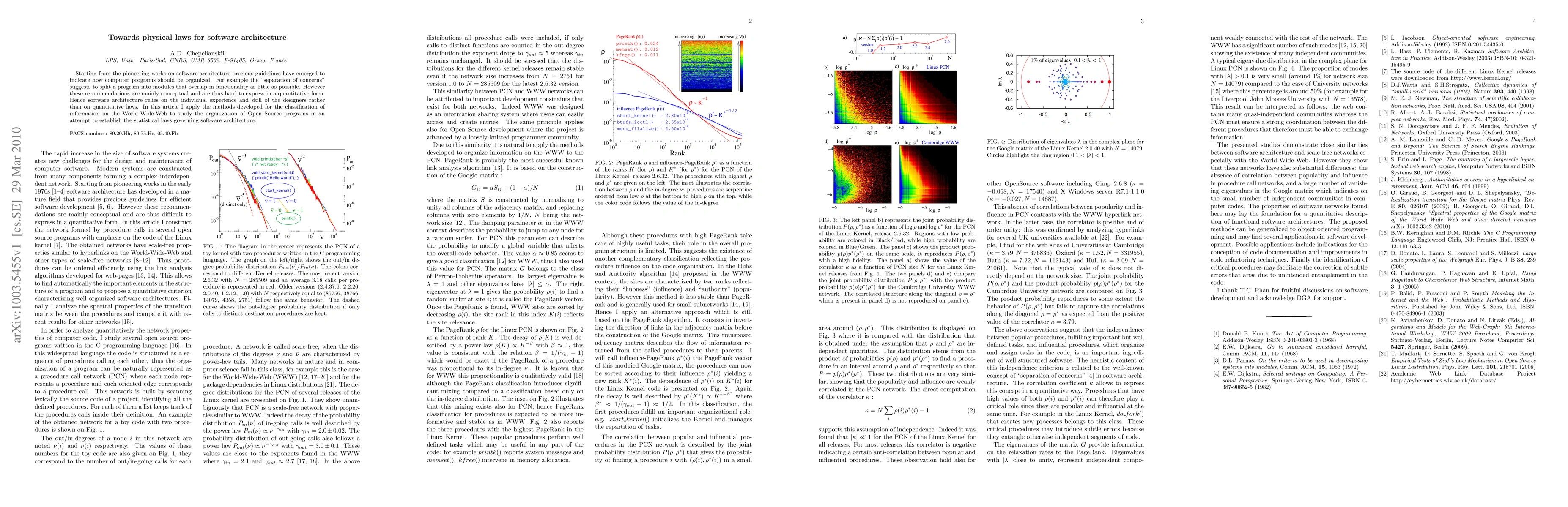 Starting from the pioneering works on software architecture precious guidelines have emerged to indicate how computer programs should be organized. For example the "separation of concerns" suggests to split a program into modules that overlap in functionality as little as possible. However these recommendations are mainly conceptual and are thus hard to express in a quantitative form. Hence software architecture relies on the individual experience and skill of the designers rather than on quantitative laws. In this article I apply the methods developed for the classification of information on the World-Wide-Web to study the organization of Open Source programs in an attempt to establish the statistical laws governing software architecture.