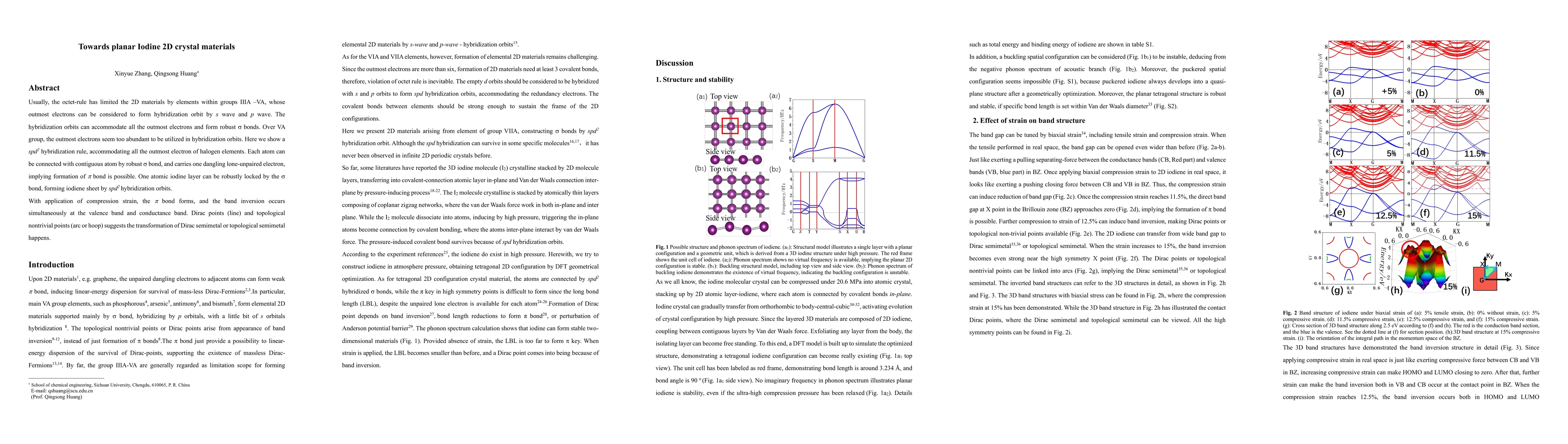Usually, the octet rule has limited the 2D materials by elements within groups IIIA_VA, whose outmost electrons can be considered to form hybridization orbit by s wave and p wave. The hybridization orbits can accommodate all the outmost electrons and form robust sigma bonds. Over VA group, the outmost electrons seem too abundant to be utilized in hybridization orbits. Here we show a spd2 hybridization rule, accommodating all the outmost electron of halogen elements. Each atom can be connected with contiguous atom by robust sigma bond, and carries one dangling lone-unpaired electron, implying formation of pi bond is possible. One atomic iodine layer can be robustly locked by the sigma bond, forming iodiene sheet by spd2 hybridization orbits. With application of compression strain, the pi bond forms, and the band inversion occurs simultaneously at the valence band and conductance band. Dirac points (line) and topological nontrivial points (arc or hoop) suggests the transformation of Dirac semimetal or topological semimetal happens.