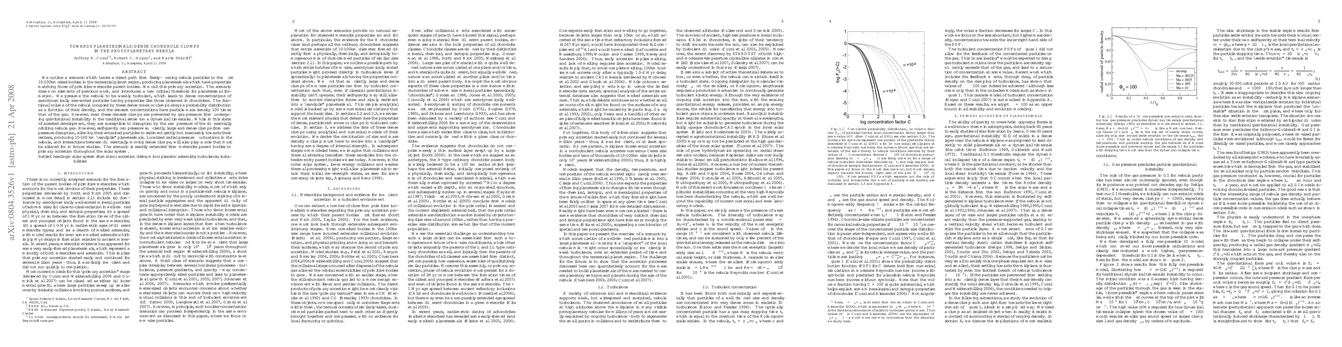 We outline a scenario which traces a direct path from freely-floating nebula particles to the first 10-100km-sized bodies in the terrestrial planet region, producing planetesimals which have properties matching those of primitive meteorite parent bodies. We call this "primary accretion". The scenario draws on elements of previous work, and introduces a new critical threshold for planetesimal formation. We presume the nebula to be weakly turbulent, which leads to dense concentrations of aerodynamically size-sorted particles having properties like those observed in chondrites. The fractional volume of the nebula occupied by these dense zones or clumps obeys a probability distribution as a function of their density, and the densest concentrations have particle mass density 100 times that of the gas. However, even these densest clumps are prevented by gas pressure from undergoing gravitational instability in the traditional sense (on a dynamical timescale). While in this state of arrested development, they are susceptible to disruption by the ram pressure of the differentially orbiting nebula gas. However, self-gravity can preserve sufficiently large and dense clumps from ram pressure disruption, allowing their entrained particles to sediment gently but inexorably towards their centers, producing 10-100 km "sandpile" planetesimals. Localized radial pressure fluctuations in the nebula, and interactions between differentially moving dense clumps, will also play a role that must be allowed for in future studies. The scenario is readily extended from meteorite parent bodies to primary accretion throughout the solar system.