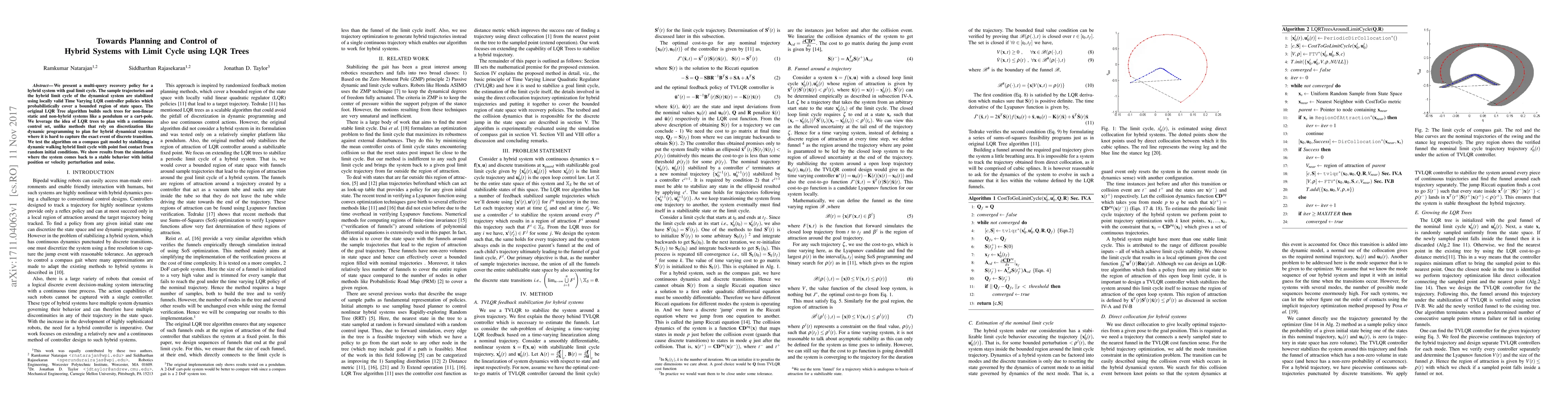 This paper proposes a new approach to planning and control for hybrid systems using LQR trees, enabling the stabilization of limit cycles in complex dynamic systems. It successfully tests the algorithm on a compass gait model, demonstrating its ability to recover from initial position or velocity perturbation and noise.