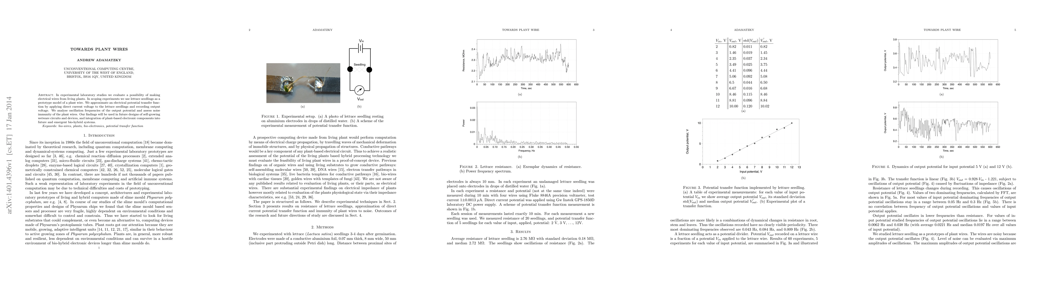 In experimental laboratory studies we evaluate a possibility of making electrical wires from living plants. In scoping experiments we use lettuce seedlings as a prototype model of a plant wire. We approximate an electrical potential transfer function by applying direct current voltage to the lettuce seedlings and recording output voltage. We analyse oscillation frequencies of the output potential and assess noise immunity of the plant wires. Our findings will be used in future designs of self-growing wetware circuits and devices, and integration of plant-based electronic components into future and emergent bio-hybrid systems.