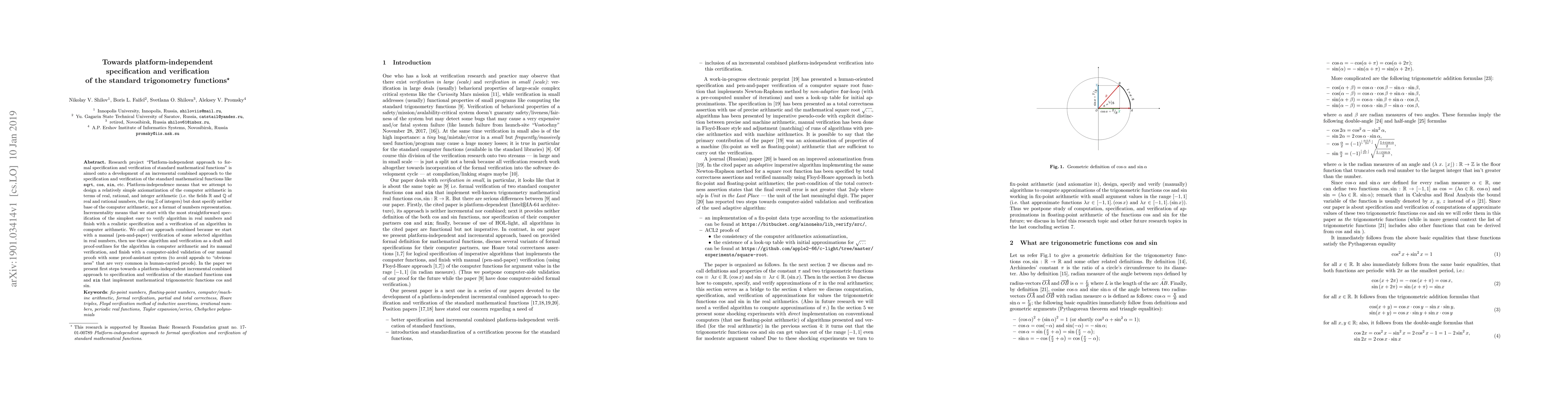 Research project "Platform-independent approach to formal specification and verification of standard mathematical functions" is aimed onto a development of an incremental combined approach to the specification and verification of the standard mathematical functions like sqrt, cos, sin, etc. Platform-independence means that we attempt to design a relatively simple axiomatization of the computer arithmetic in terms of real, rational, and integer arithmetic (i.e. the fields R and Q of real and rational numbers, the ring Z of integers) but don't specify neither base of the computer arithmetic, nor a format of numbers' representation. Incrementality means that we start with the most straightforward specification of the simplest easy to verify algorithm in real numbers and finish with a realistic specification and a verification of an algorithm in computer arithmetic. We call our approach combined because we start with a manual (pen-and-paper) verification of some selected algorithm in real numbers, then use these algorithm and verification as a draft and proof-outlines for the algorithm in computer arithmetic and its manual verification, and finish with a computer-aided validation of our manual proofs with some proof-assistant system (to avoid appeals to "obviousness" that are very common in human-carried proofs). In the paper we present first steps towards a platform-independent incremental combined approach to specification and verification of the standard functions cos and sin that implement mathematical trigonometric functions cos and sin.