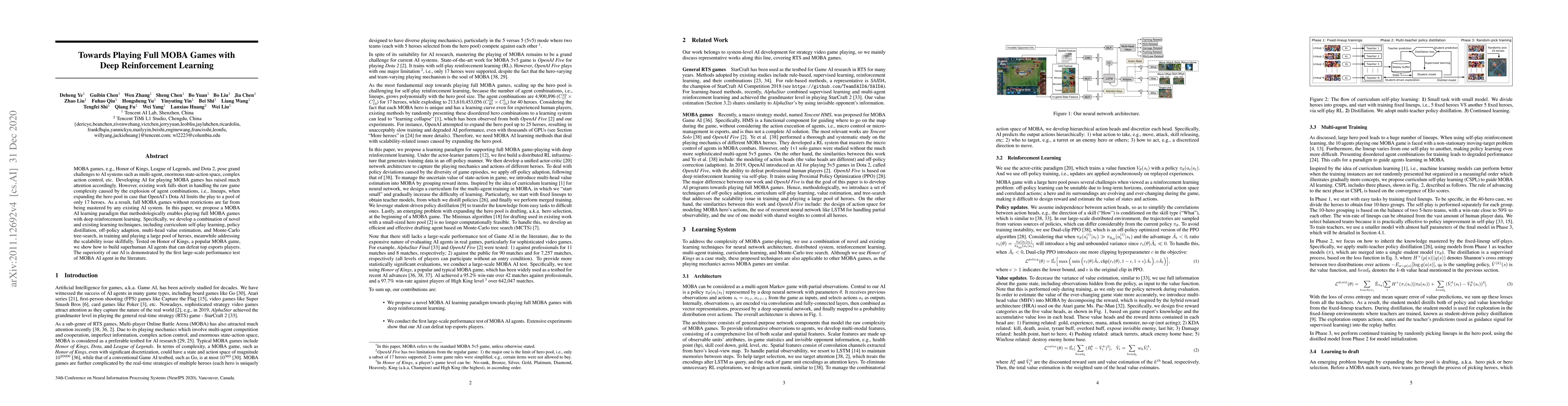 This paper proposes a deep reinforcement learning paradigm to enable AI to play full MOBA games without restrictions, addressing the scalability issues through techniques like curriculum self-play, policy distillation, and multi-head value estimation. The developed AI agents demonstrated superhuman performance by defeating top esports players in Honor of Kings.