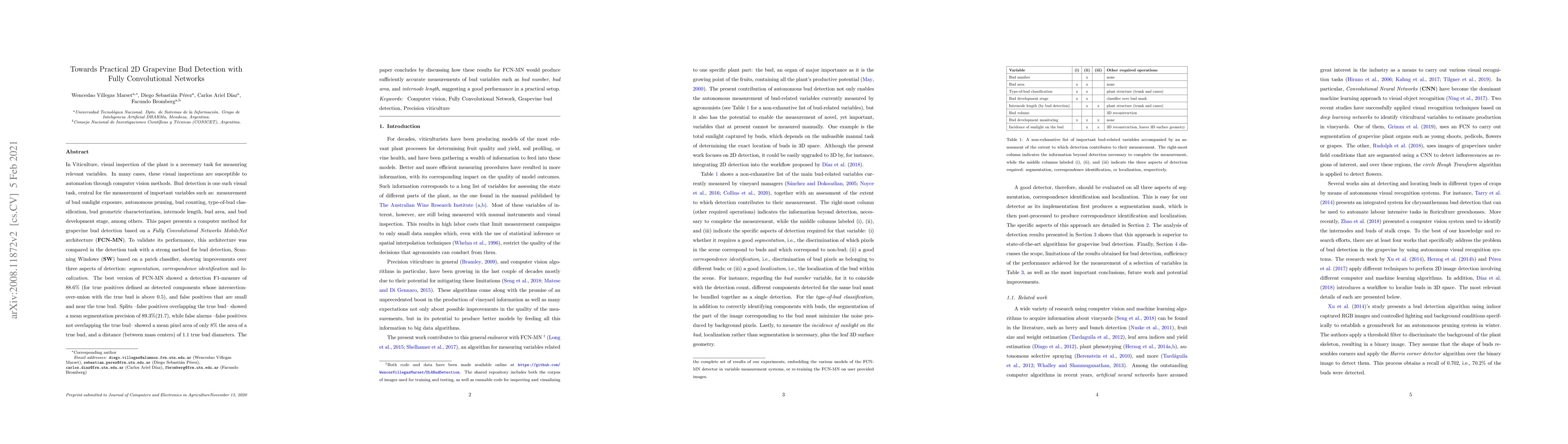 This paper introduces a Fully Convolutional Networks MobileNet architecture (FCN-MN) for grapevine bud detection, achieving an F1-measure of 88.6% and significantly reducing false positives. The method shows promise for practical applications in viticulture by accurately measuring bud variables like bud number and internode length.