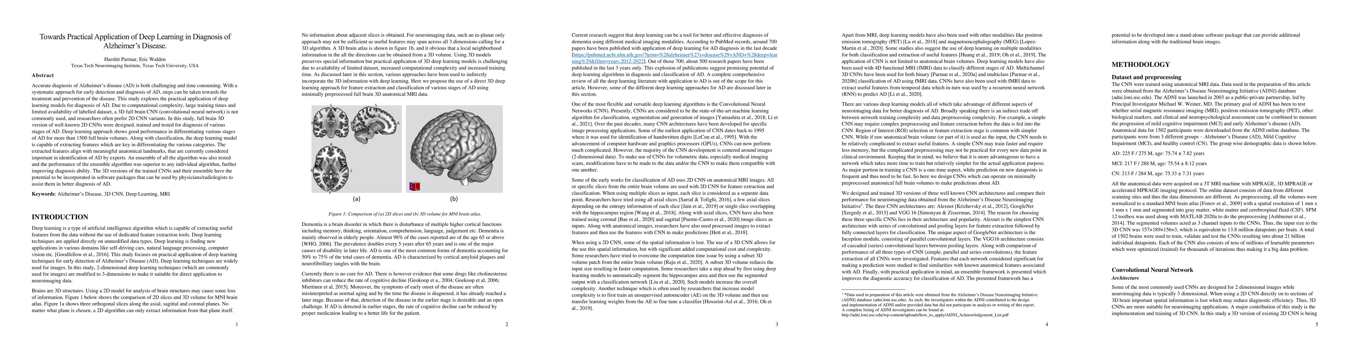 Accurate diagnosis of Alzheimer's disease (AD) is both challenging and time consuming. With a systematic approach for early detection and diagnosis of AD, steps can be taken towards the treatment and prevention of the disease. This study explores the practical application of deep learning models for diagnosis of AD. Due to computational complexity, large training times and limited availability of labelled dataset, a 3D full brain CNN (convolutional neural network) is not commonly used, and researchers often prefer 2D CNN variants. In this study, full brain 3D version of well-known 2D CNNs were designed, trained and tested for diagnosis of various stages of AD. Deep learning approach shows good performance in differentiating various stages of AD for more than 1500 full brain volumes. Along with classification, the deep learning model is capable of extracting features which are key in differentiating the various categories. The extracted features align with meaningful anatomical landmarks, that are currently considered important in identification of AD by experts. An ensemble of all the algorithm was also tested and the performance of the ensemble algorithm was superior to any individual algorithm, further improving diagnosis ability. The 3D versions of the trained CNNs and their ensemble have the potential to be incorporated in software packages that can be used by physicians/radiologists to assist them in better diagnosis of AD.