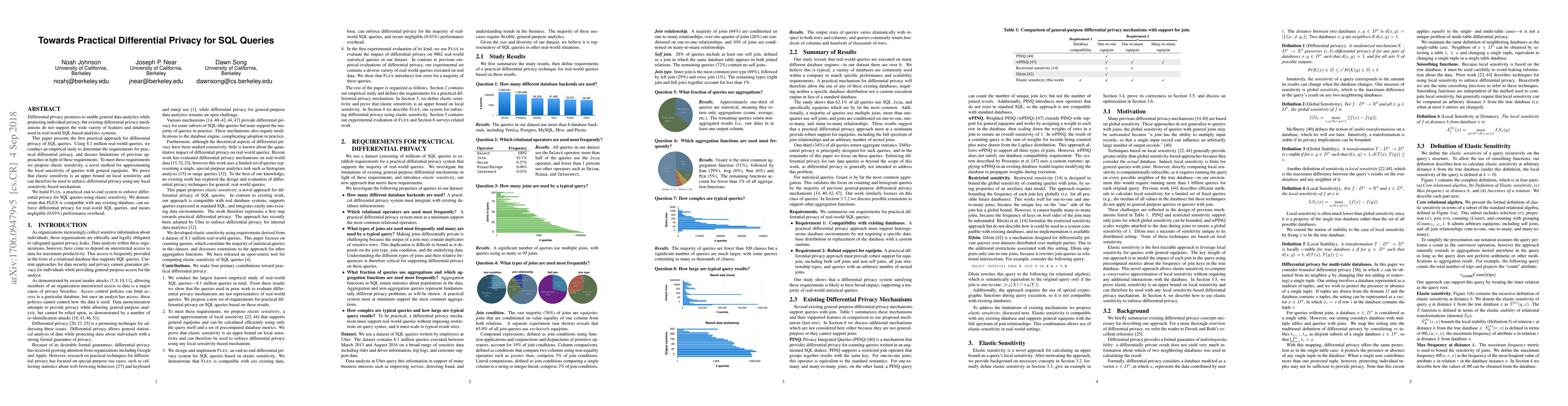 This paper introduces a practical approach for enforcing differential privacy on SQL queries, addressing the limitations of existing methods. It proposes "elastic sensitivity" to approximate query sensitivity and presents FLEX, a system that enforces differential privacy with minimal performance impact.