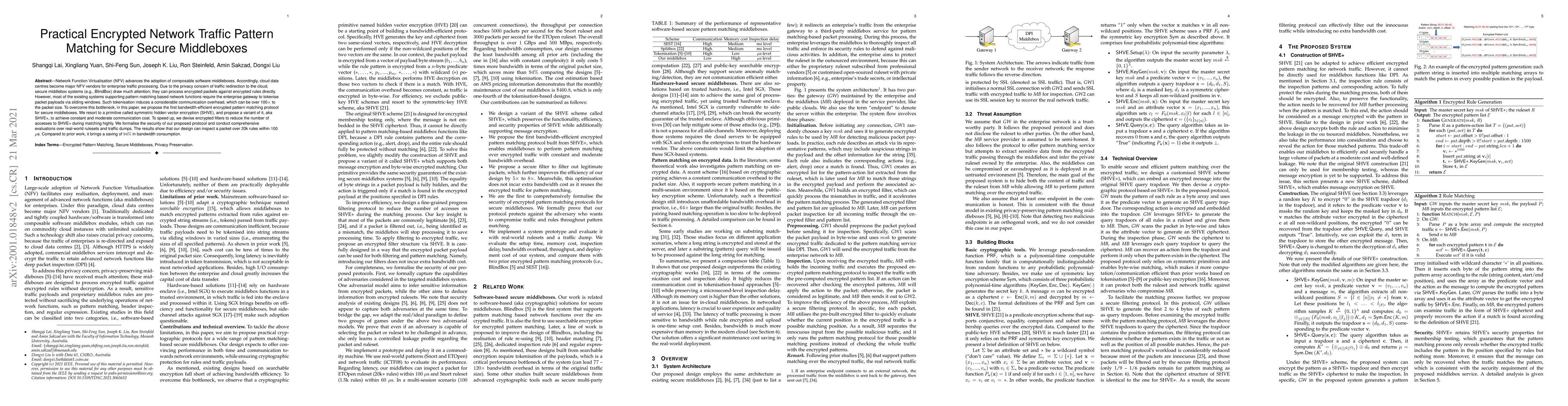 This paper proposes an efficient encrypted pattern matching protocol for secure middleboxes in NFV environments, using symmetric hidden vector encryption (SHVE+) and encrypted filters to reduce communication overhead and speed up processing. The protocol achieves a 94% bandwidth saving compared to prior methods while maintaining security.