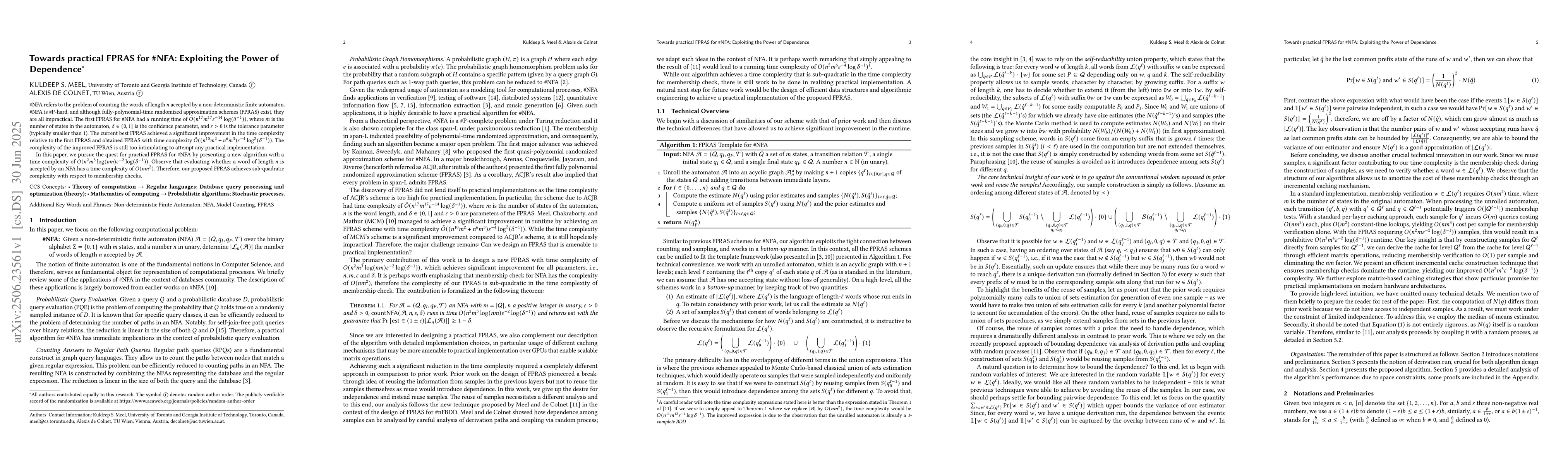 #NFA refers to the problem of counting the words of length $n$ accepted by a non-deterministic finite automaton. #NFA is #P-hard, and although fully-polynomial-time randomized approximation schemes (FPRAS) exist, they are all impractical. The first FPRAS for #NFA had a running time of $\tilde{O}(n^{17}m^{17}\varepsilon^{-14}\log(\delta^{-1}))$, where $m$ is the number of states in the automaton, $\delta \in (0,1]$ is the confidence parameter, and $\varepsilon > 0$ is the tolerance parameter (typically smaller than $1$). The current best FPRAS achieved a significant improvement in the time complexity relative to the first FPRAS and obtained FPRAS with time complexity $\tilde{O}((n^{10}m^2 + n^6m^3)\varepsilon^{-4}\log^2(\delta^{-1}))$. The complexity of the improved FPRAS is still too intimidating to attempt any practical implementation. In this paper, we pursue the quest for practical FPRAS for #NFA by presenting a new algorithm with a time complexity of $O(n^2m^3\log(nm)\varepsilon^{-2}\log(\delta^{-1}))$. Observe that evaluating whether a word of length $n$ is accepted by an NFA has a time complexity of $O(nm^2)$. Therefore, our proposed FPRAS achieves sub-quadratic complexity with respect to membership checks.